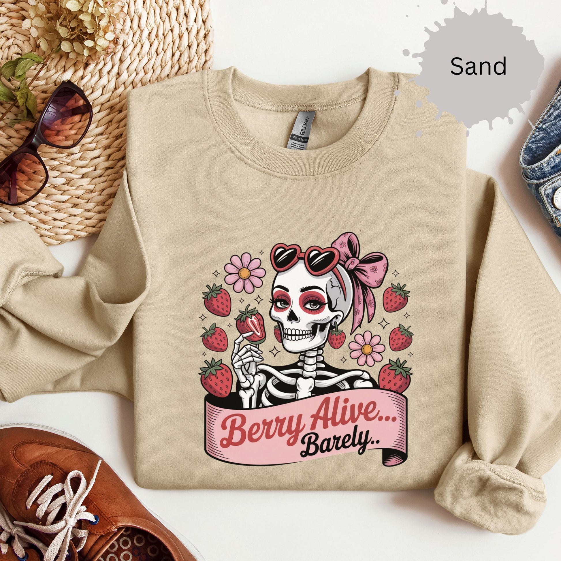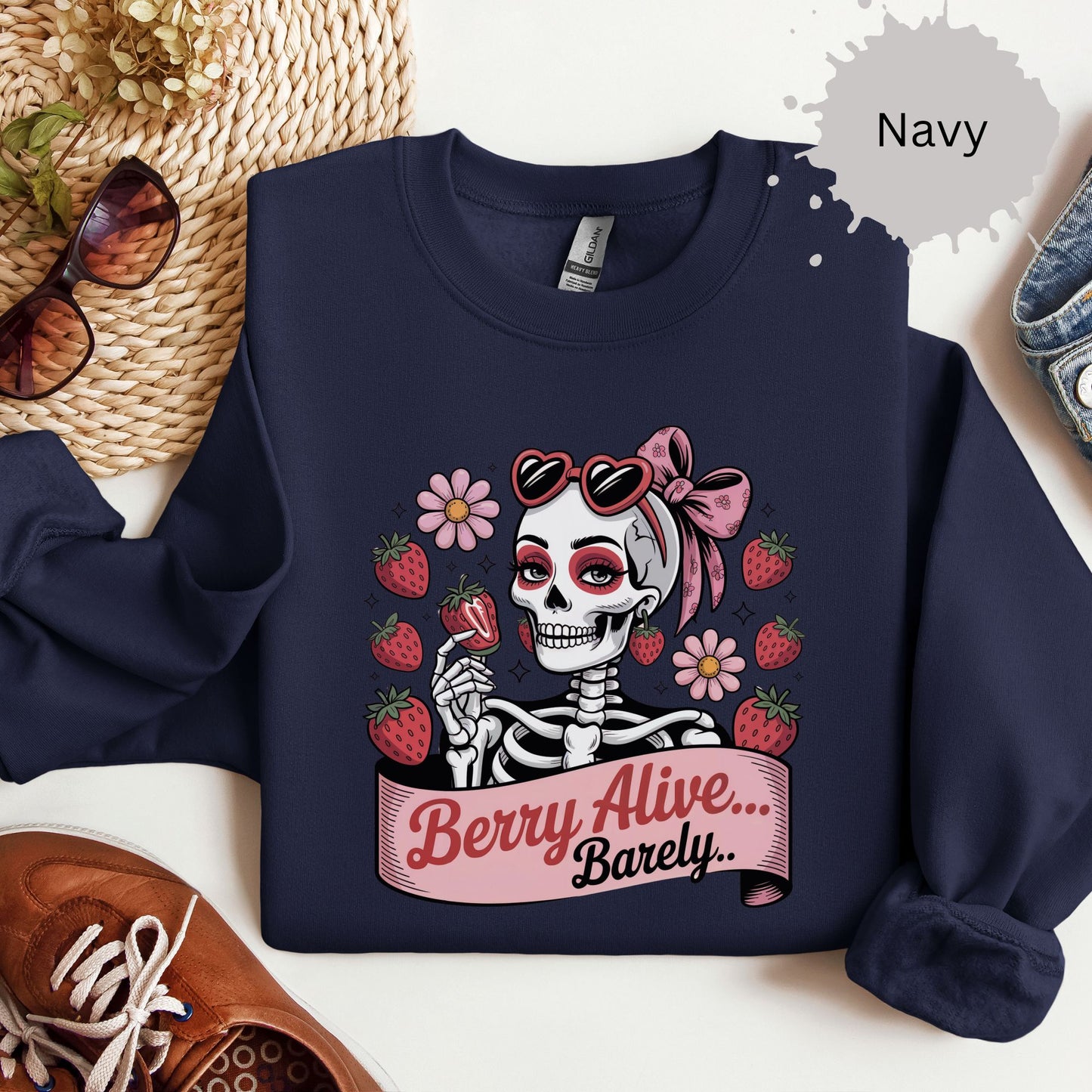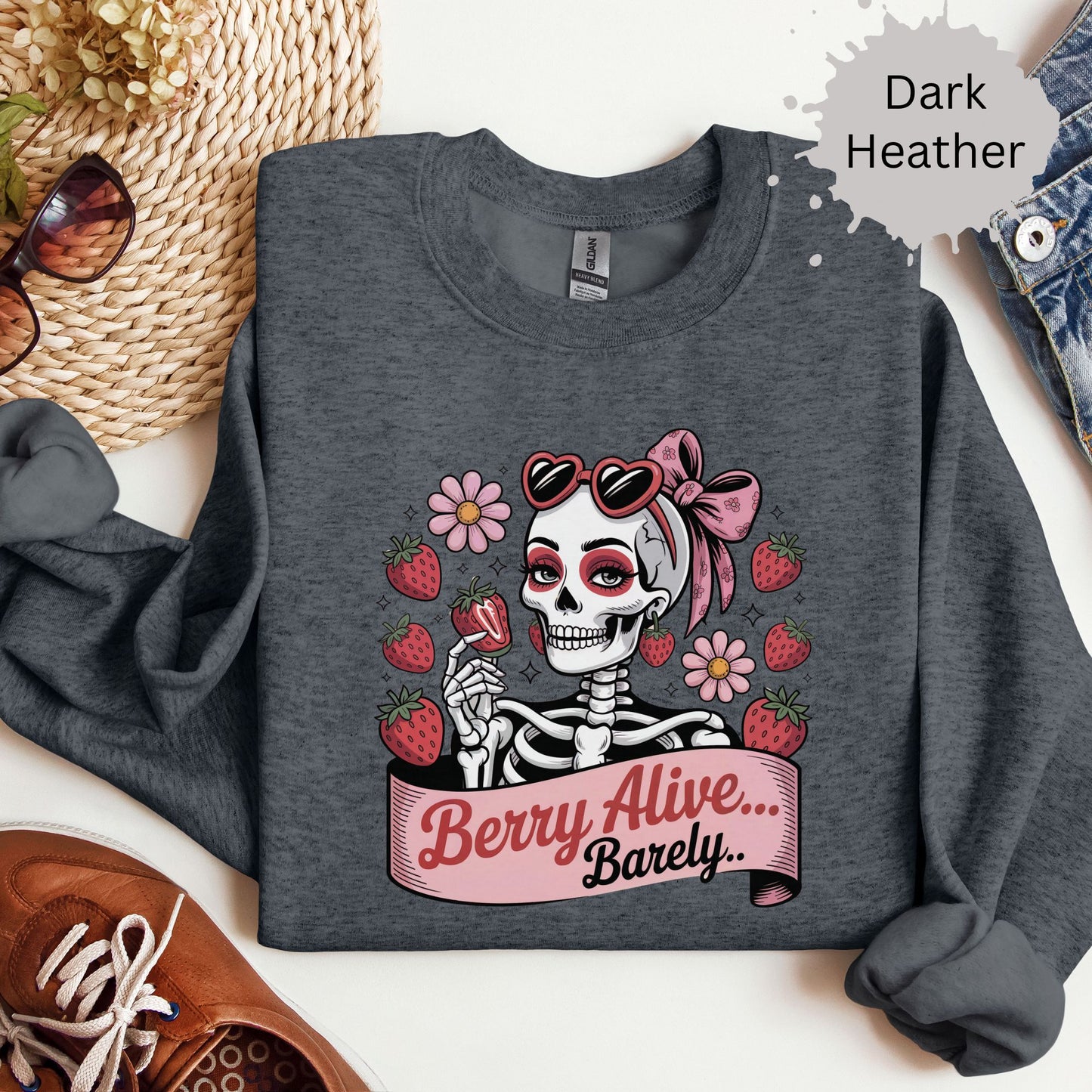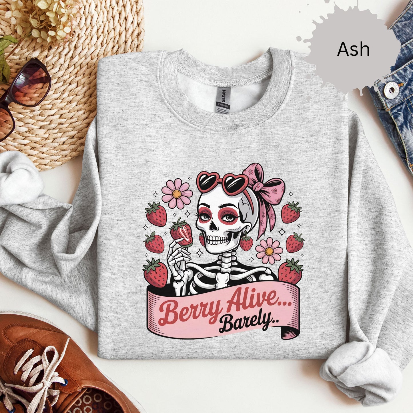 "Berry alive… barely." If seasonal burnout had a uniform, this would be it. Sweet, sassy, and spooky—this strawberry skeleton sweatshirt is for the Halloween girlies hanging on by a thread (and a berry).