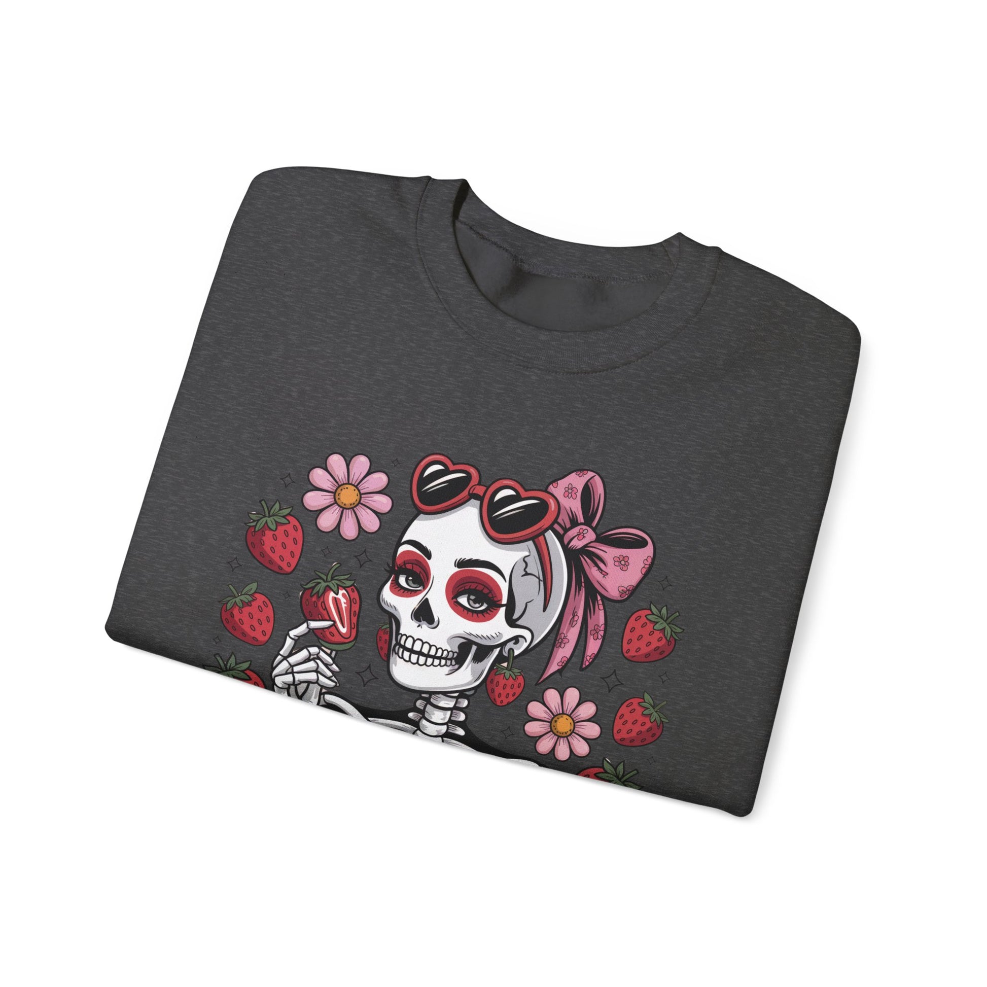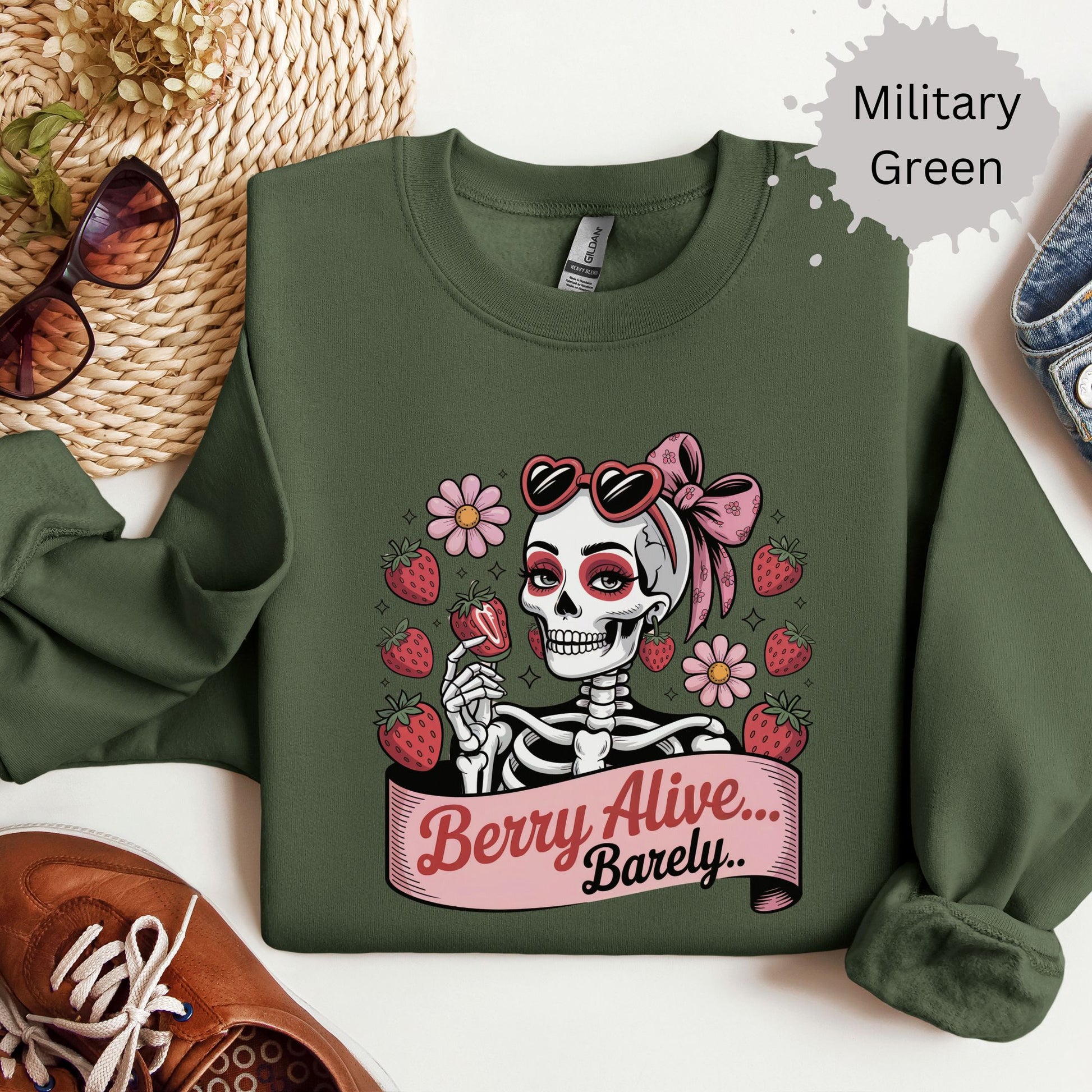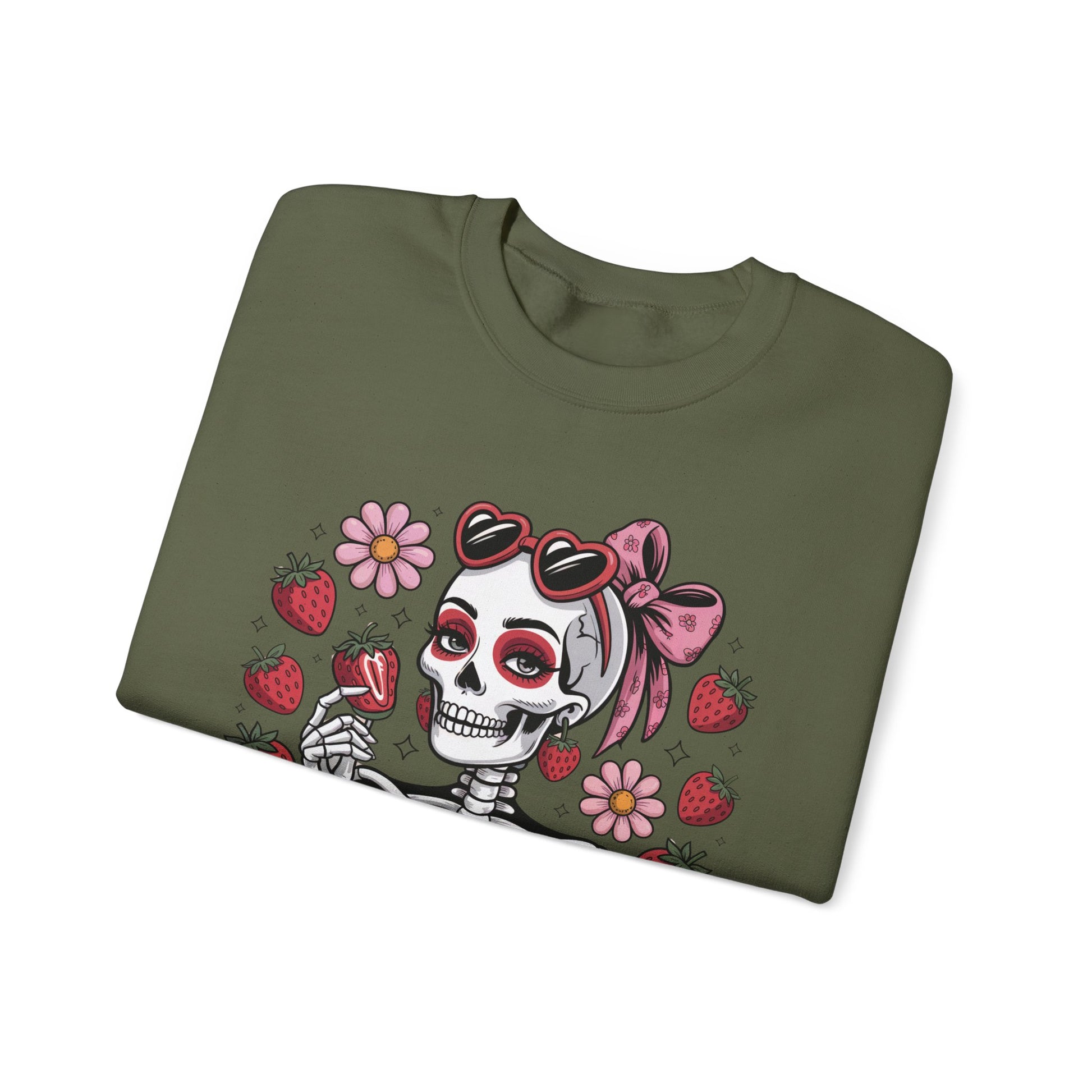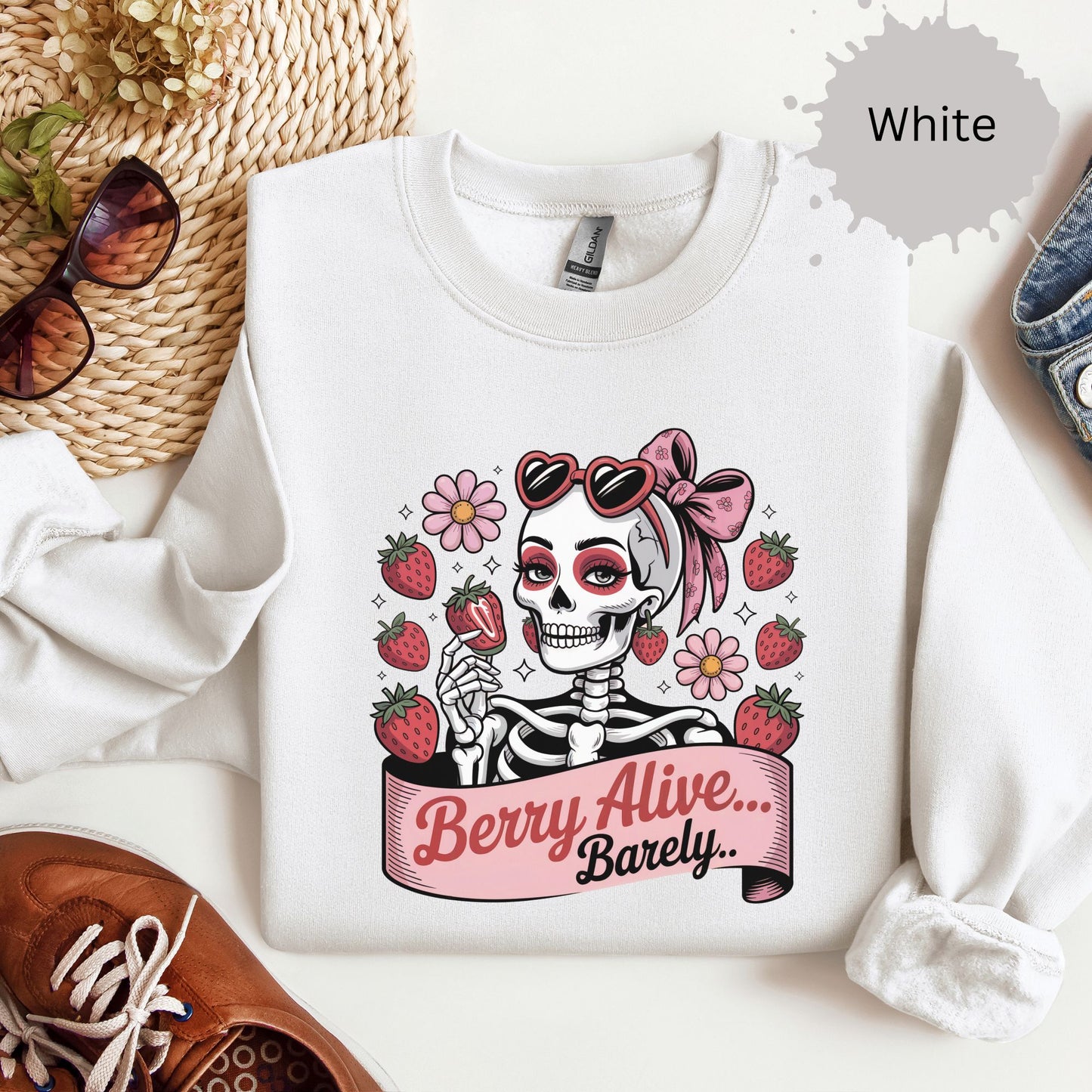 "Berry alive… barely." If seasonal burnout had a uniform, this would be it. Sweet, sassy, and spooky—this strawberry skeleton sweatshirt is for the Halloween girlies hanging on by a thread (and a berry).