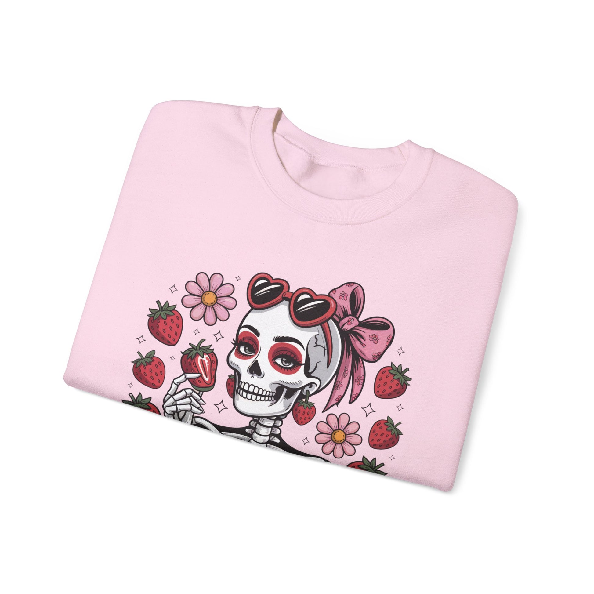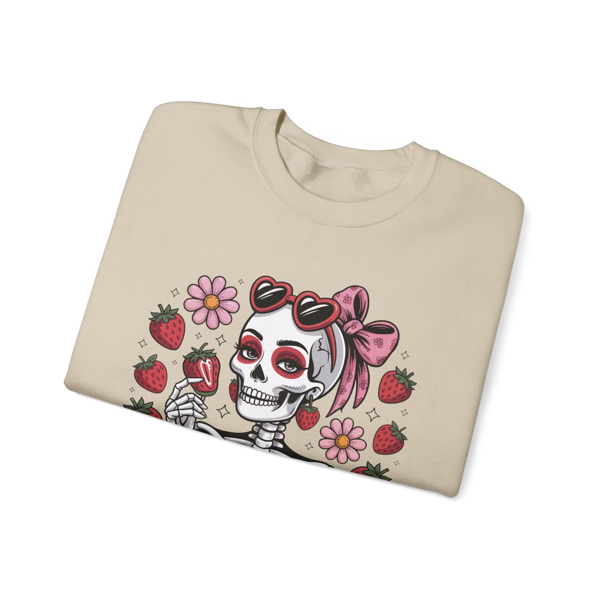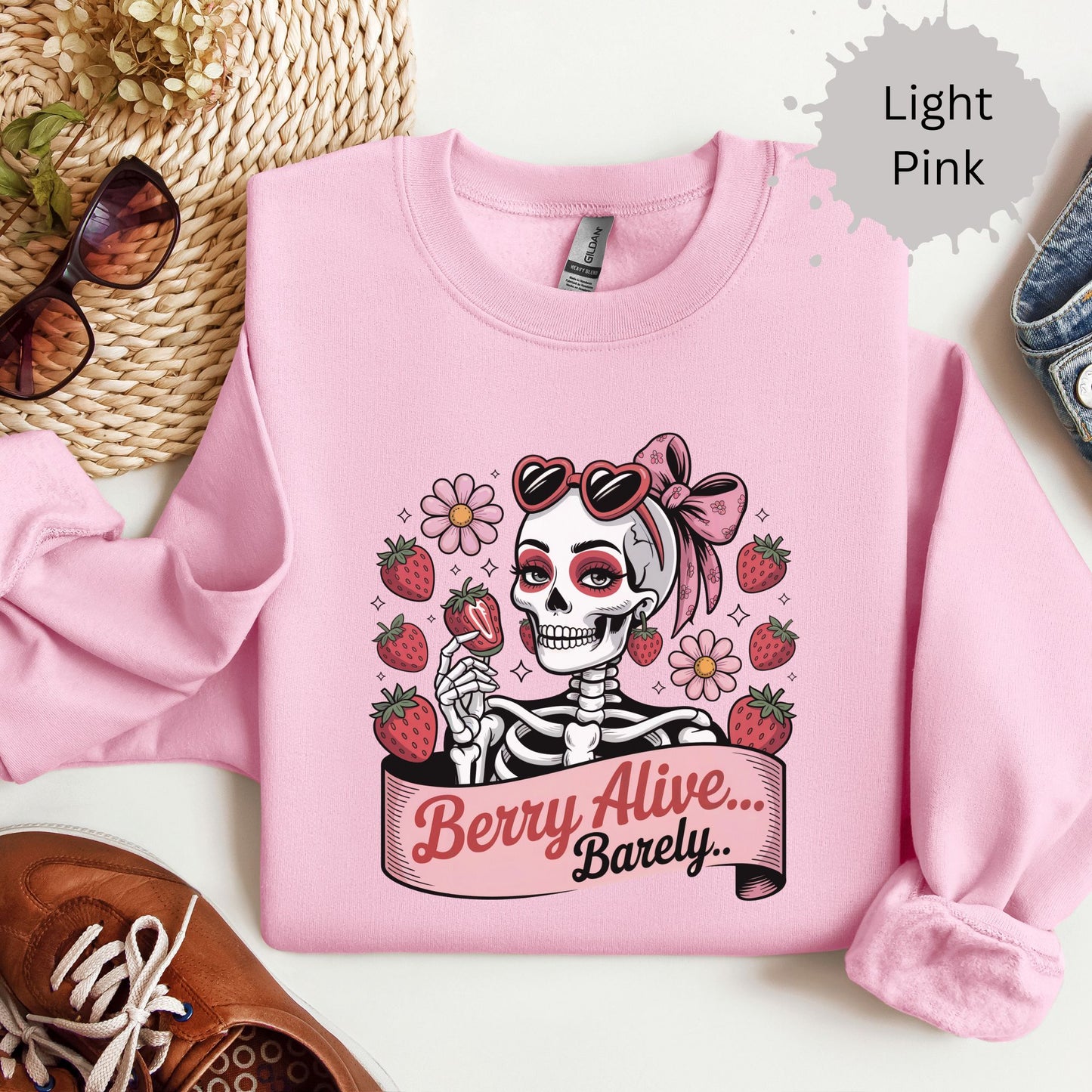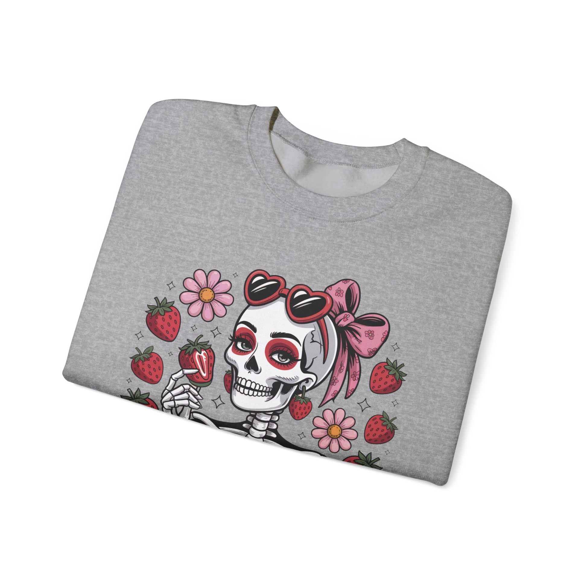 "Berry alive… barely." If seasonal burnout had a uniform, this would be it. Sweet, sassy, and spooky—this strawberry skeleton sweatshirt is for the Halloween girlies hanging on by a thread (and a berry).