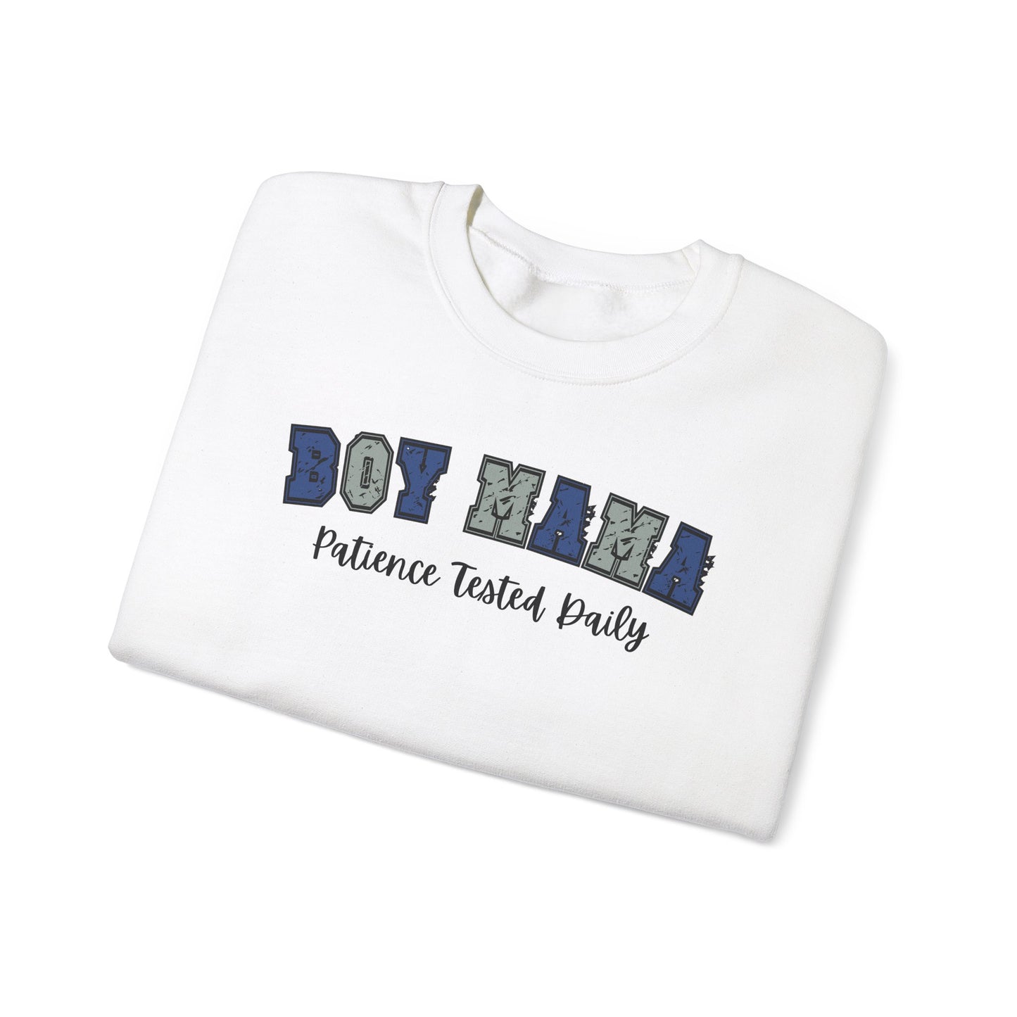 Stay cozy and stylish with this Boy Mama pullover crewneck sweatshirt - a daily uniform for embracing the joyful chaos of raising boys.