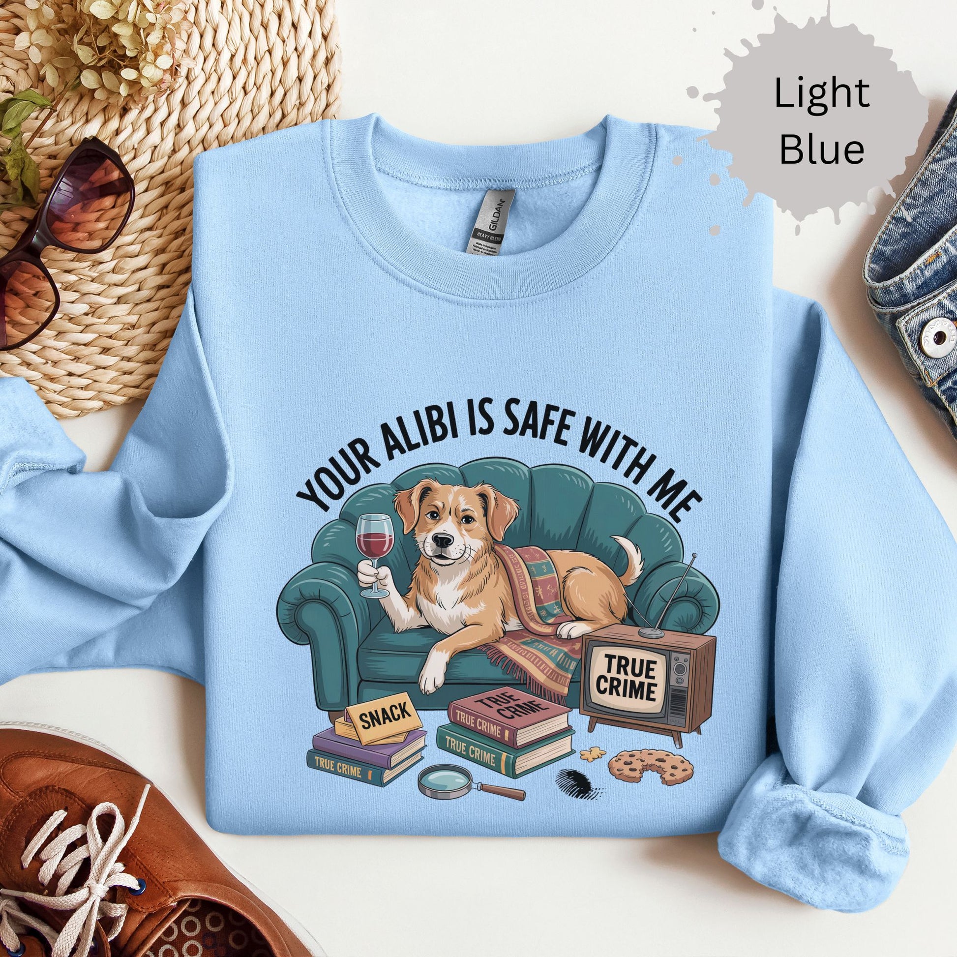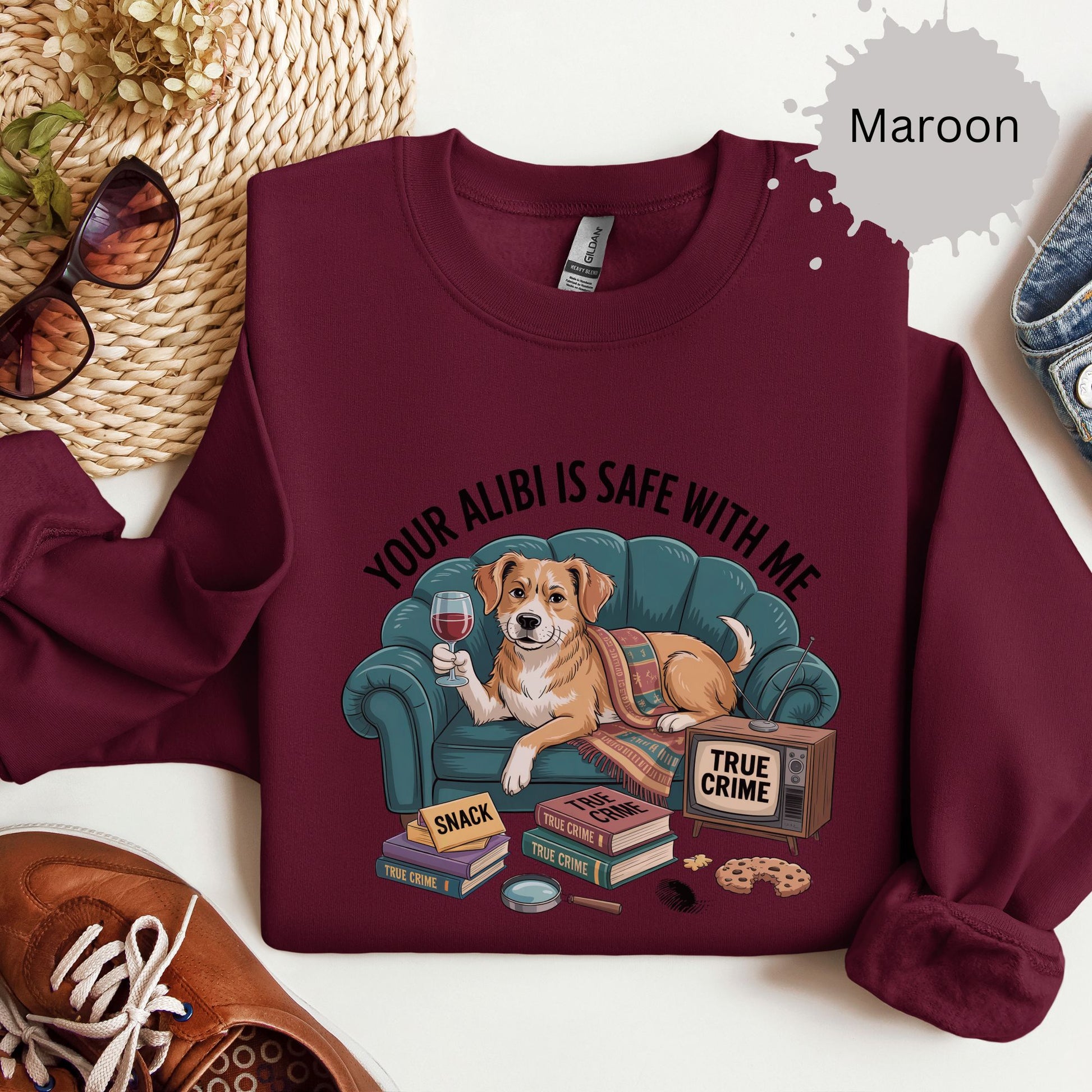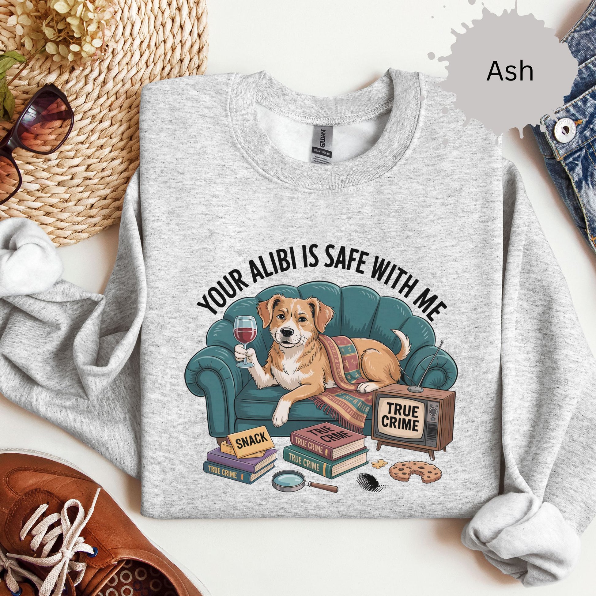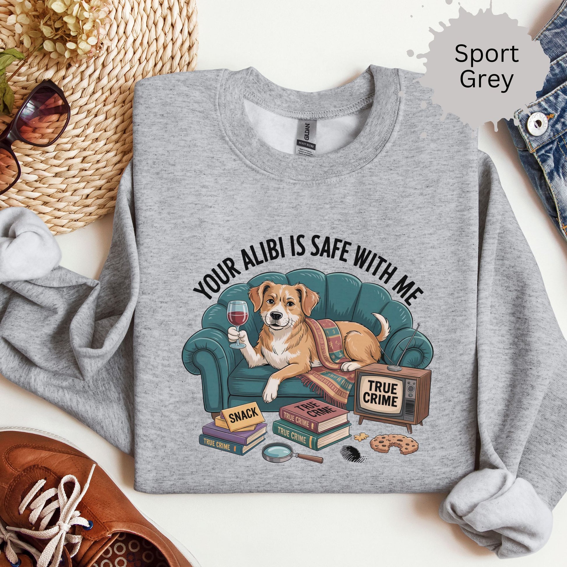 The ultimate ride-or-die. This “Your alibi is safe with me” sweatshirt features a judgmental dog wrapped in a blanket with wine and murder snacks. It’s cozy, sarcastic, and 100% emotionally supportive — perfect for podcast bingers, introverts, and true crime fans with trust issues.