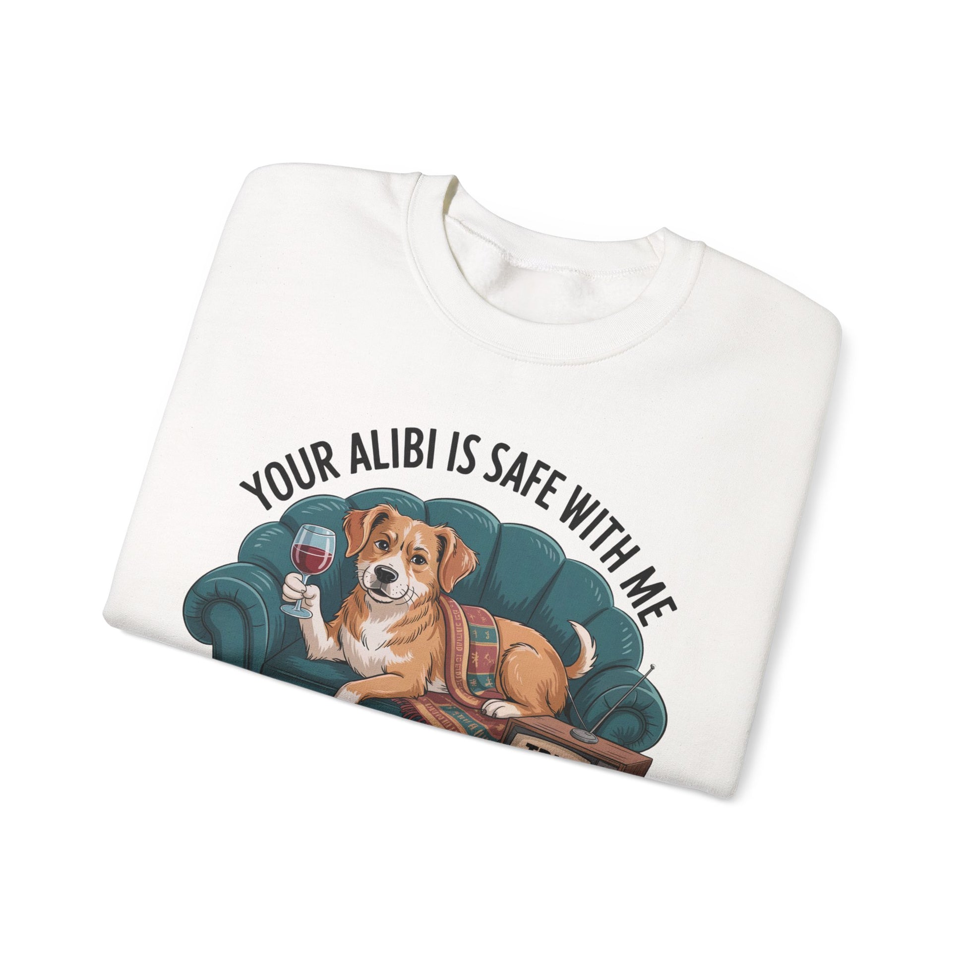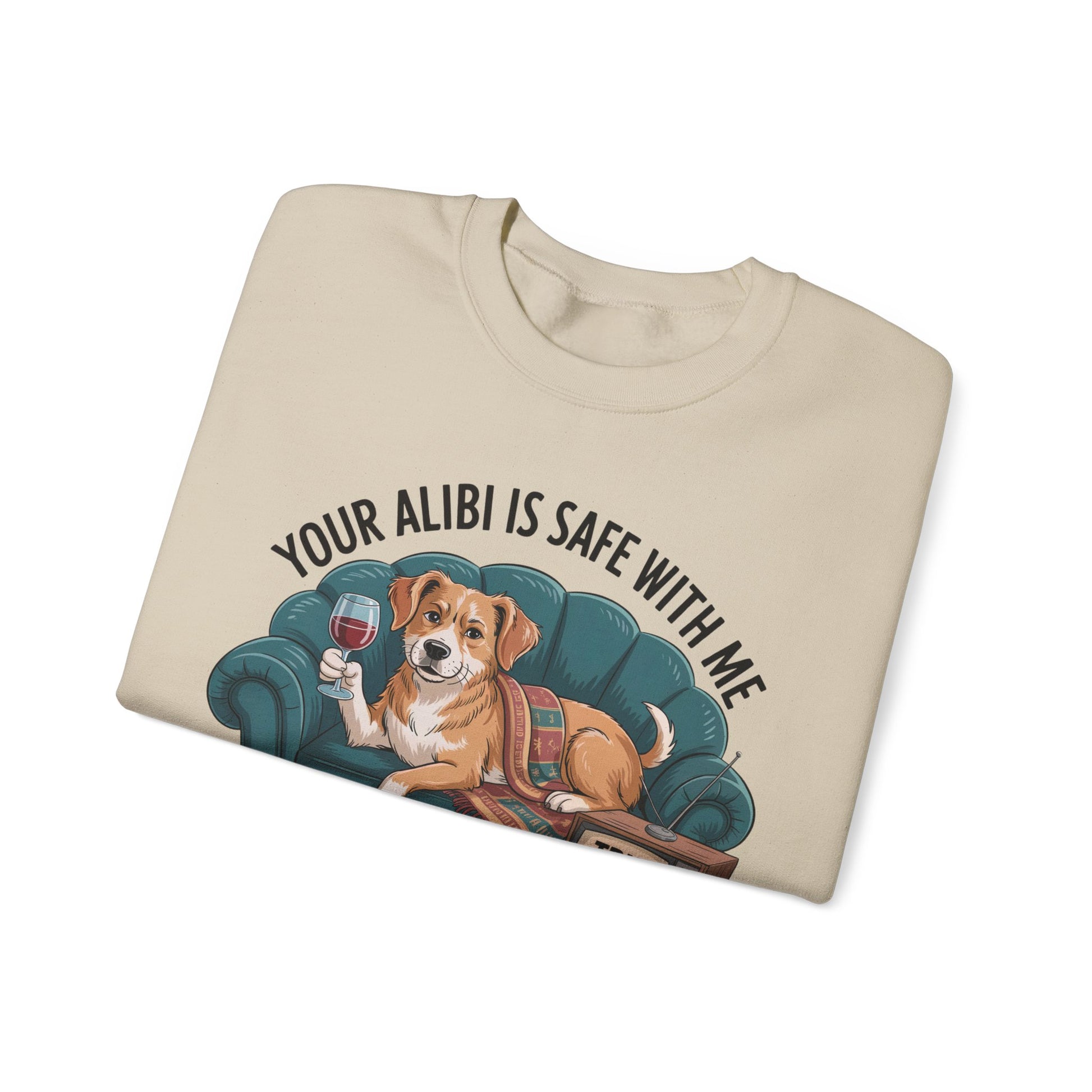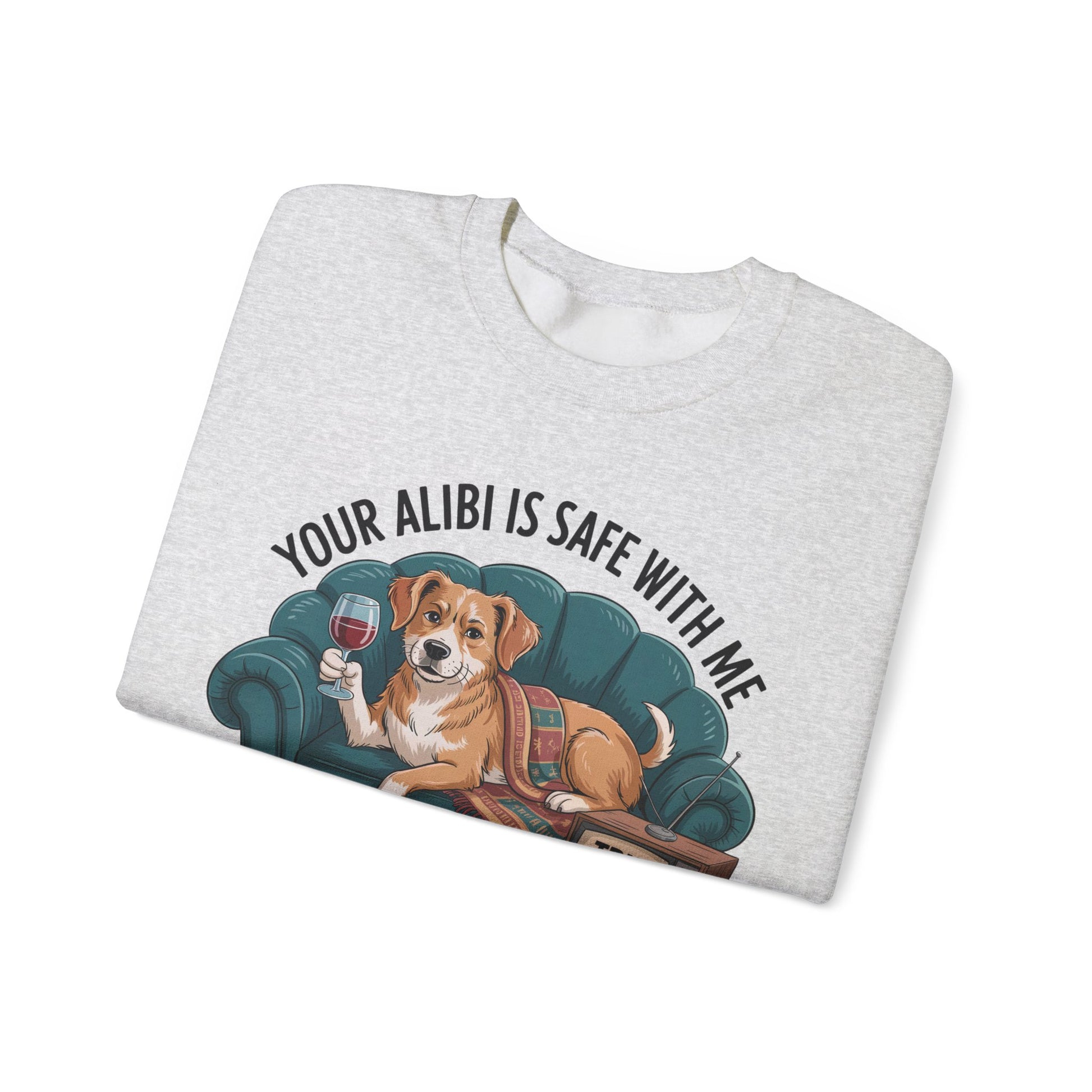 The ultimate ride-or-die. This “Your alibi is safe with me” sweatshirt features a judgmental dog wrapped in a blanket with wine and murder snacks. It’s cozy, sarcastic, and 100% emotionally supportive — perfect for podcast bingers, introverts, and true crime fans with trust issues.