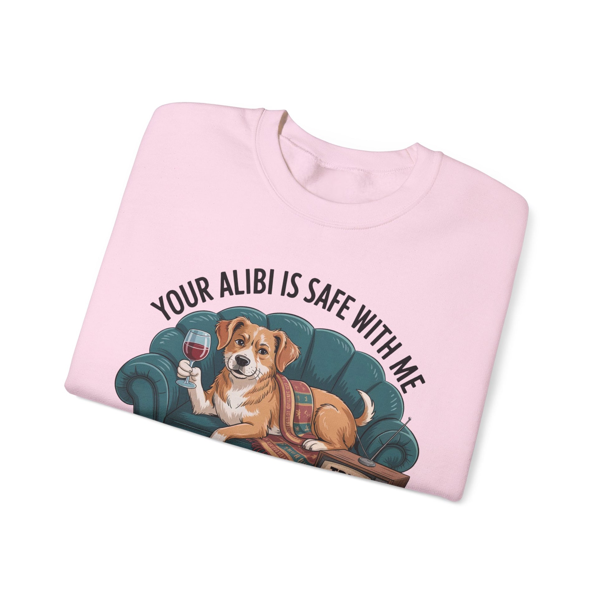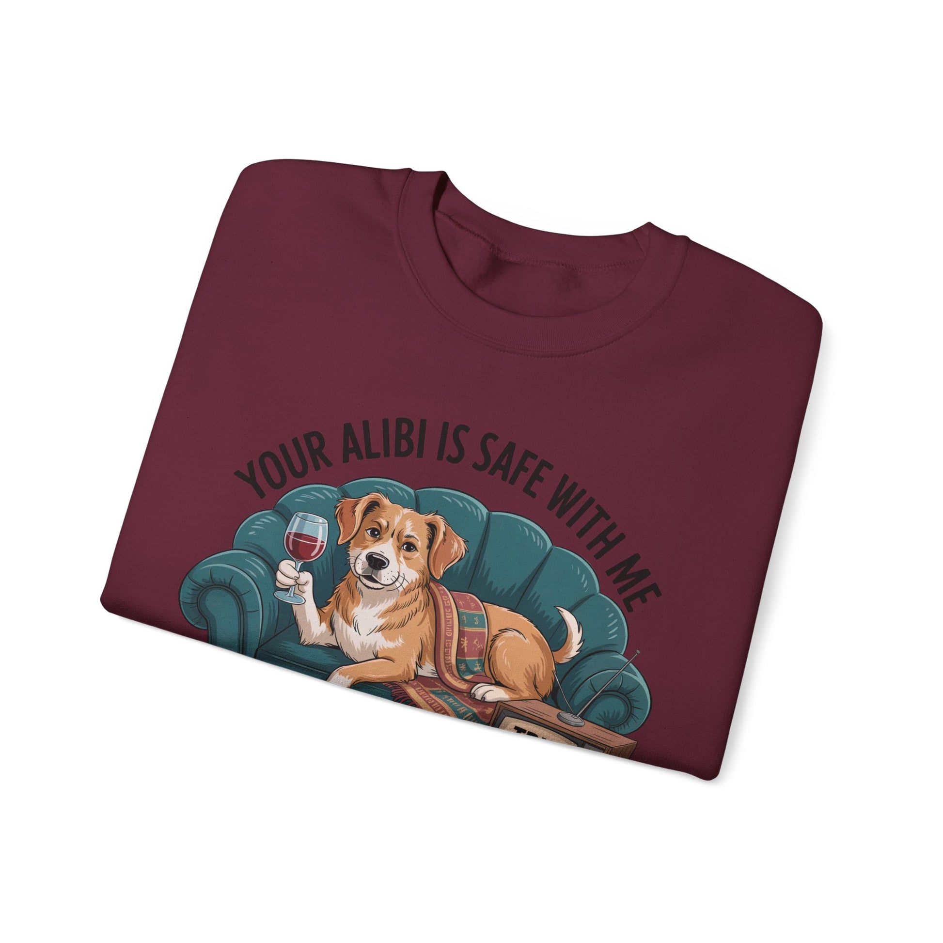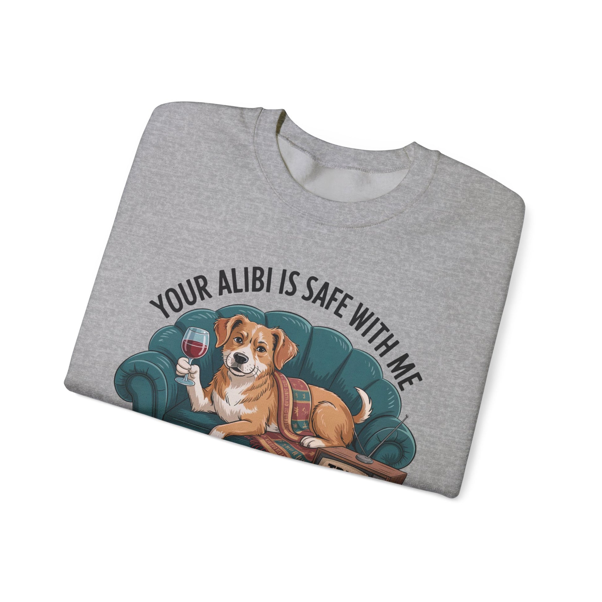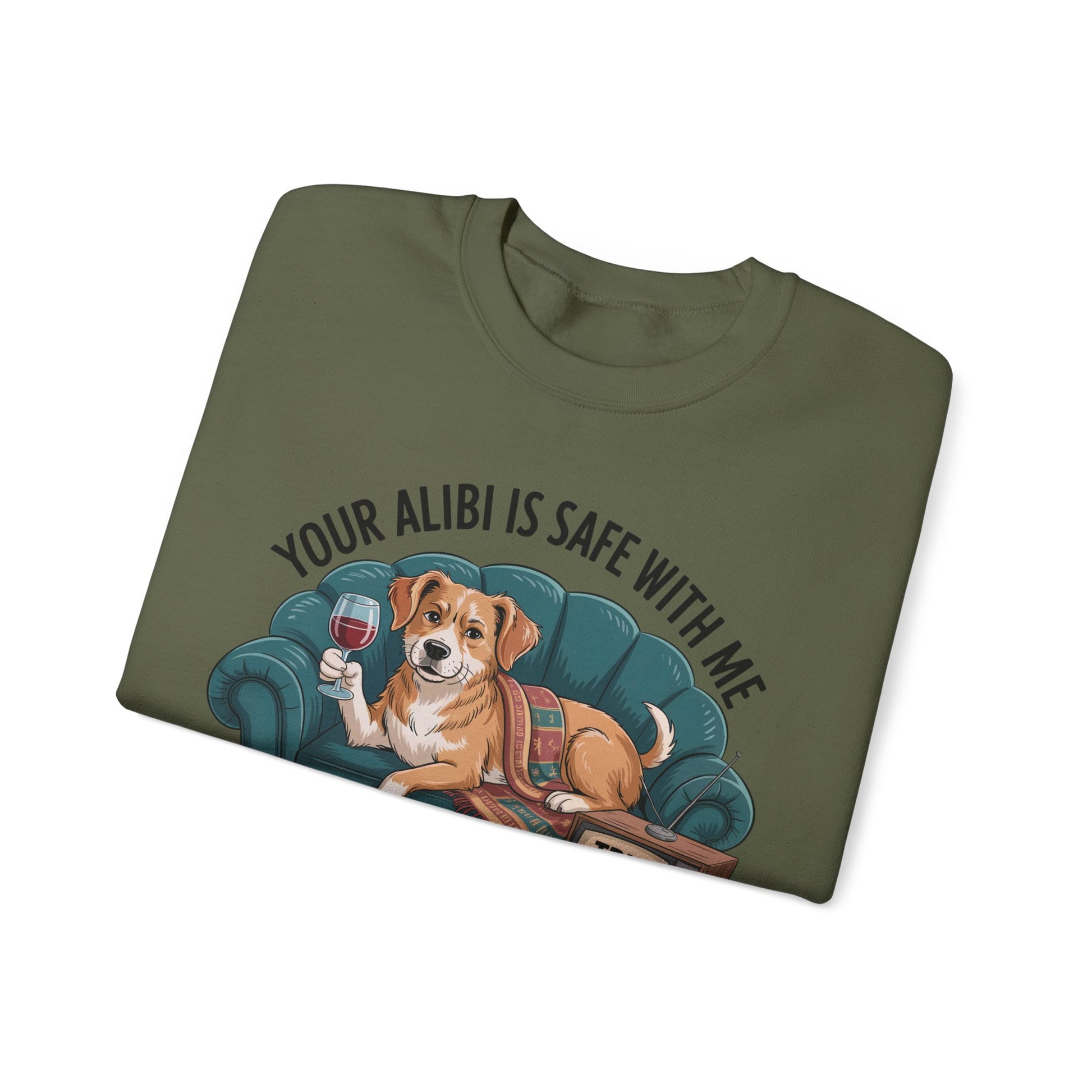 The ultimate ride-or-die. This “Your alibi is safe with me” sweatshirt features a judgmental dog wrapped in a blanket with wine and murder snacks. It’s cozy, sarcastic, and 100% emotionally supportive — perfect for podcast bingers, introverts, and true crime fans with trust issues.