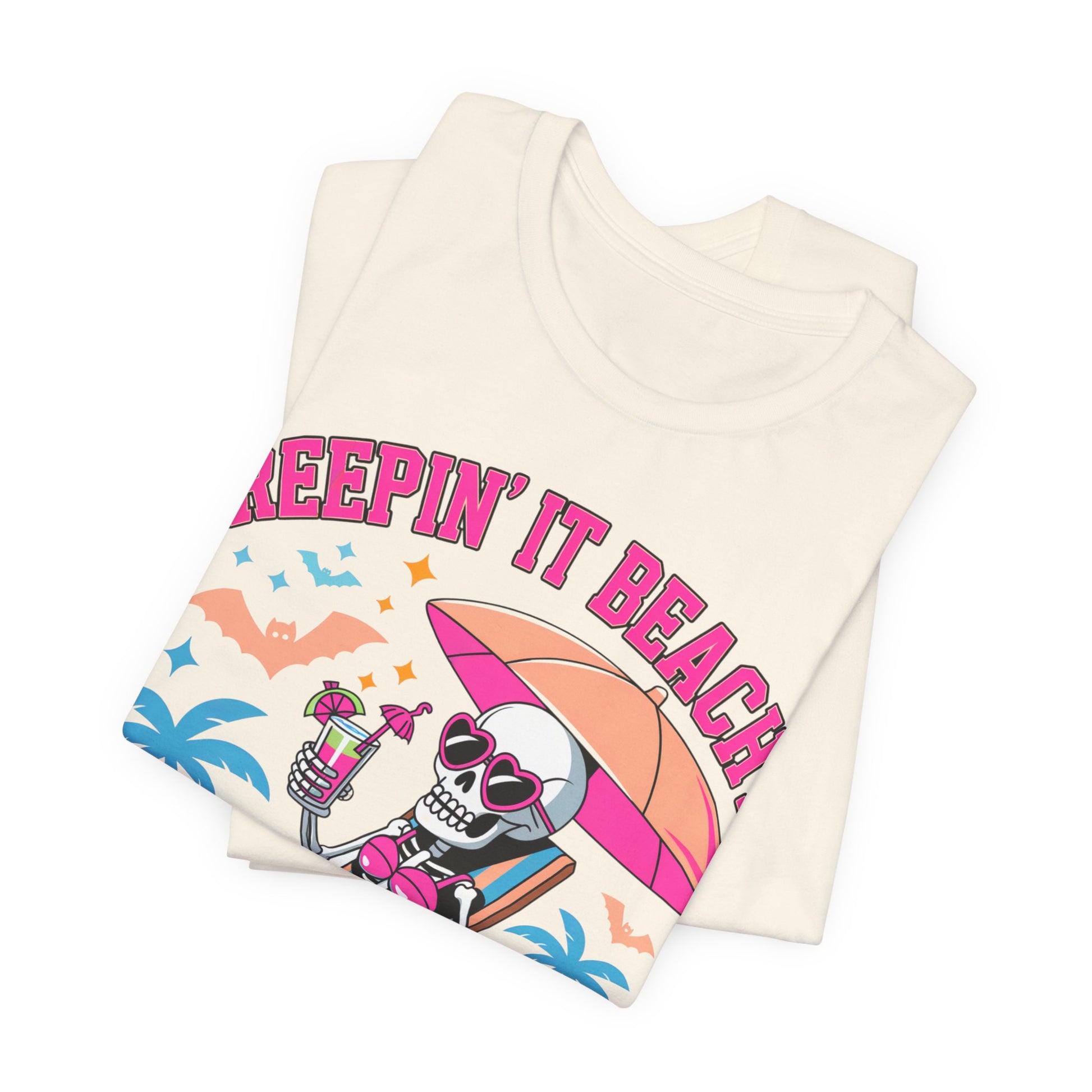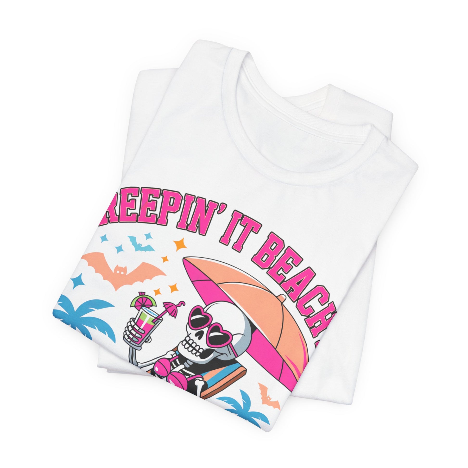 Celebrate spooky season in full sun with this bold and beachy Summerween tee. It’s the perfect fit for ghouls who glow in the dark and the daylight. Whether you're sipping spirits by the shore or haunting the pool party, this skeleton-approved shirt keeps your vibe hot, haunted, and hydrated.