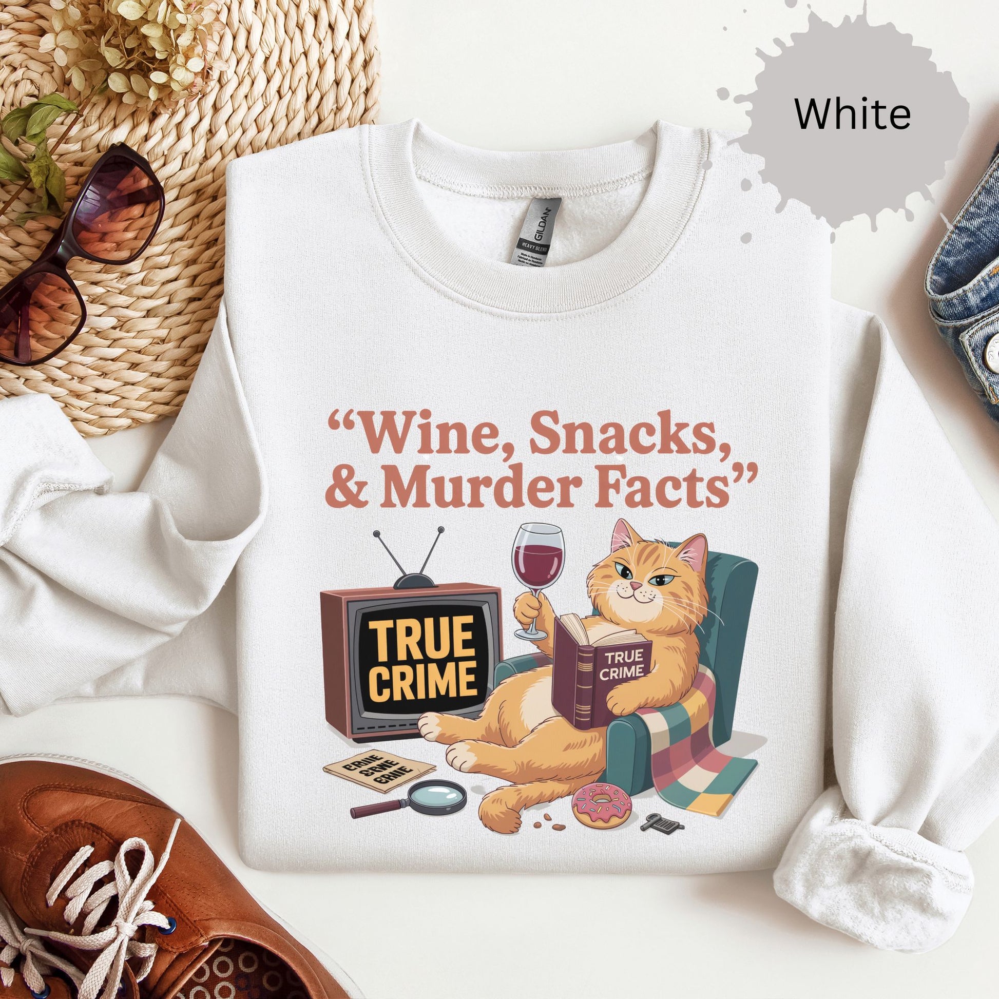 This cat has seen some things. “Wine, snacks and murder facts” captures that vibe with a judgy feline, red wine, and the eerie calm of someone who definitely knows who did it. Cozy, sarcastic, and cotton-blend soft — it’s perfect for crime junkies, podcast bingers, and emotionally unavailable cat people.