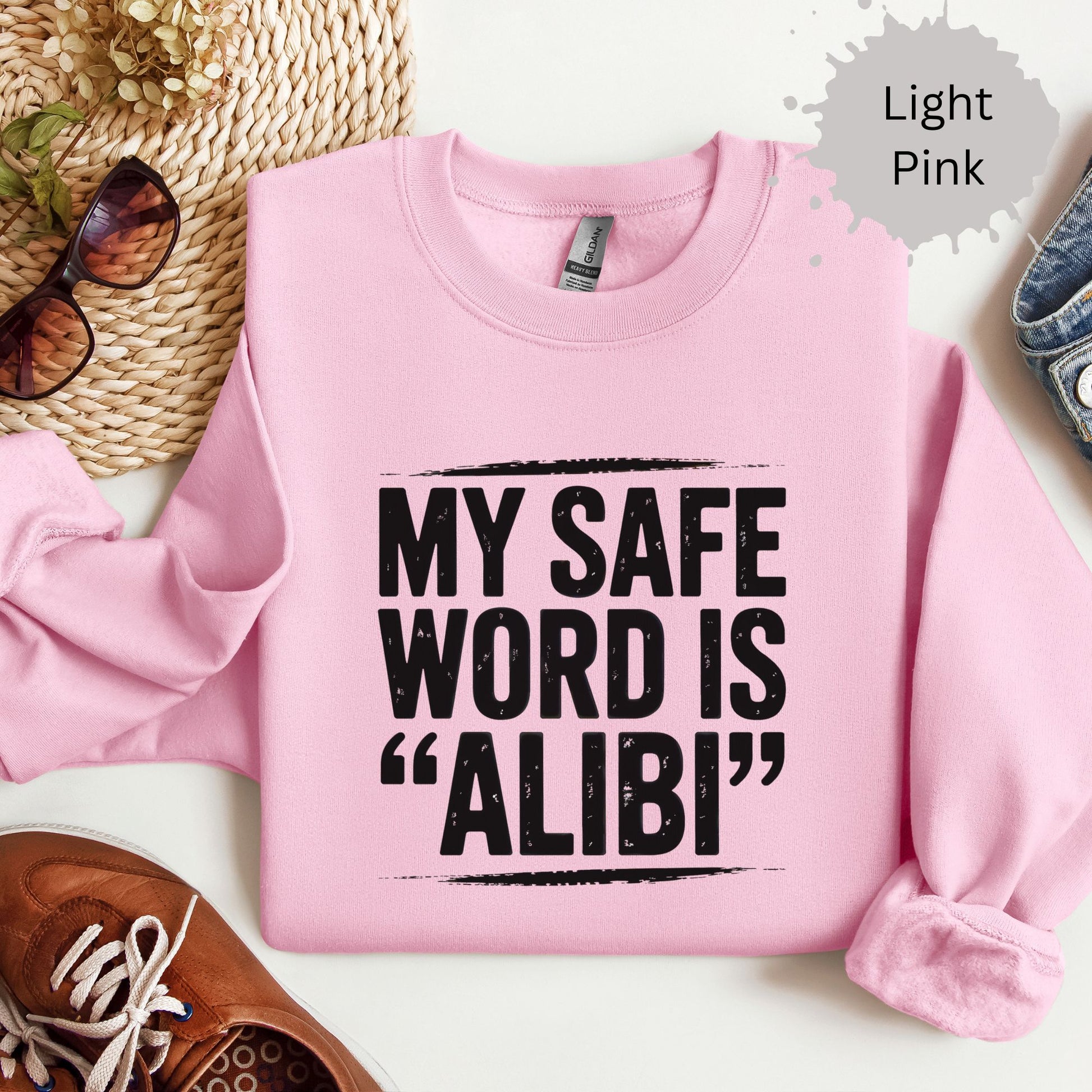 Let’s be honest — if your safe word is “alibi,” you’re probably the funniest person in the room and the one most likely to get away with it. This cozy crewneck is perfect for true crime fans with a twisted sense of humor and a love for sarcasm.