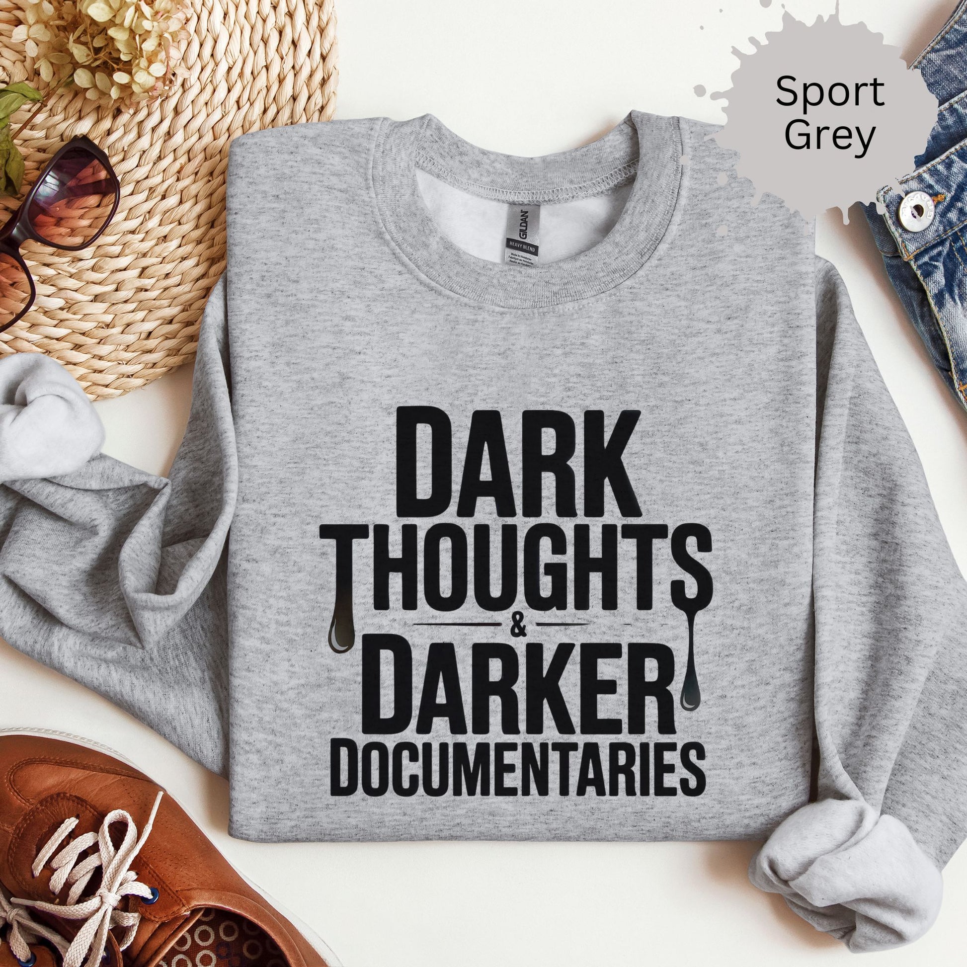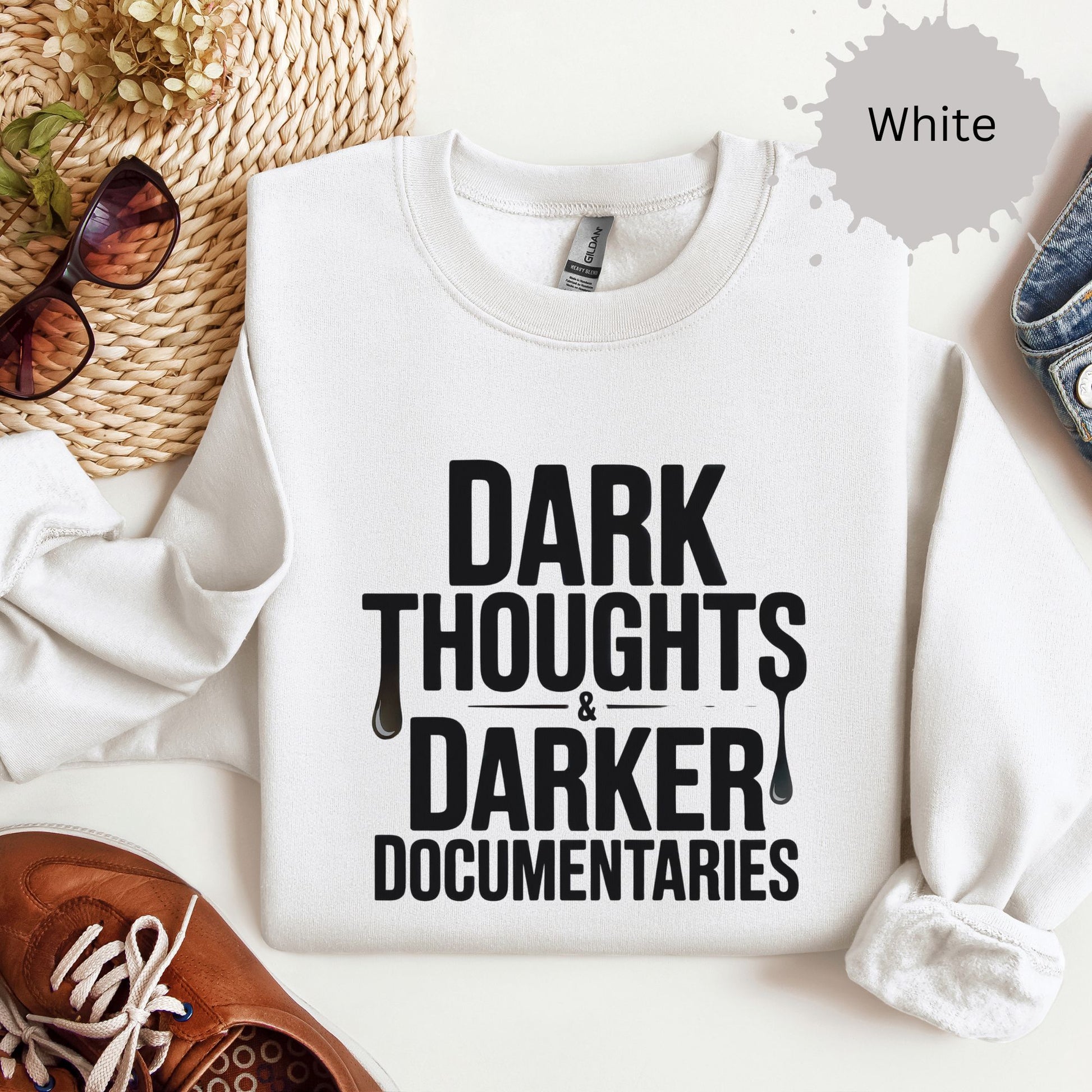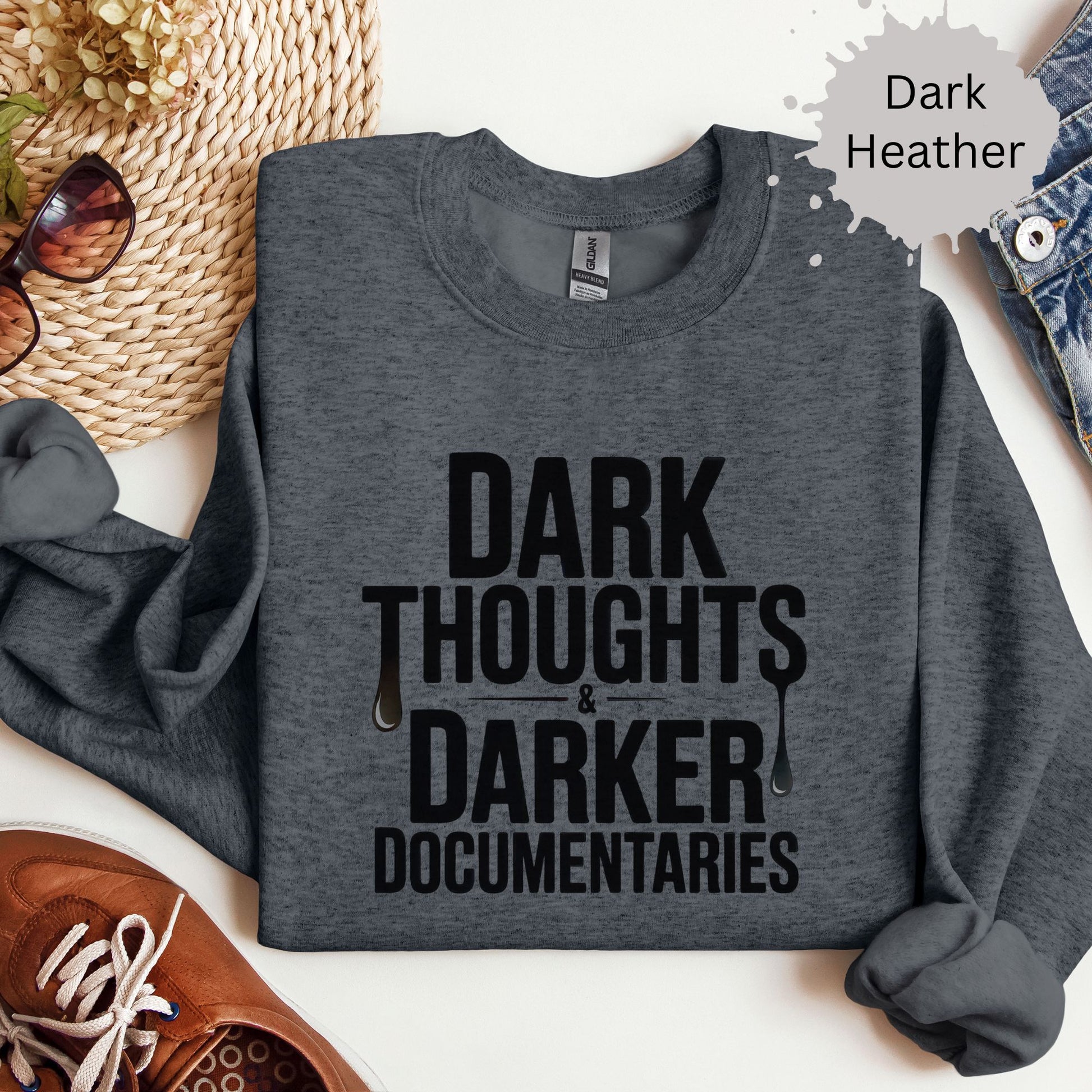 This “Dark thoughts, darker documentaries” pullover crewneck sweatshirt is made for the emotionally unavailable introvert who finds joy in fictional murder and soft cotton. Whether you're binging Netflix docs or side-eyeing suspects from your couch, this cozy crewneck serves sarcasm and spooky vibes in equal measure.