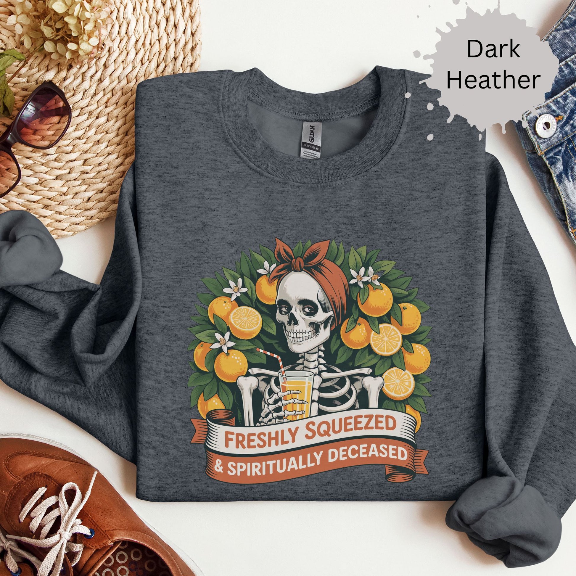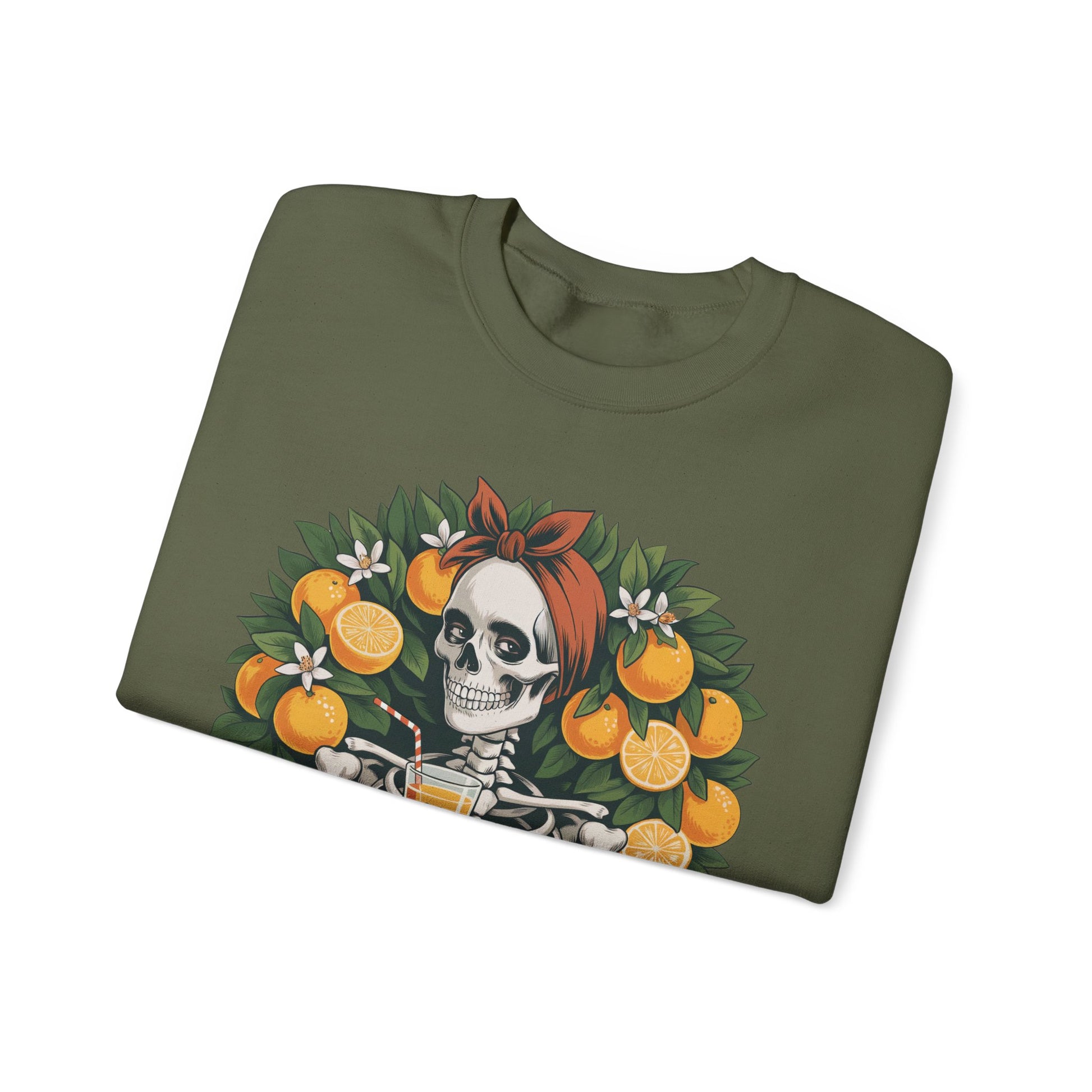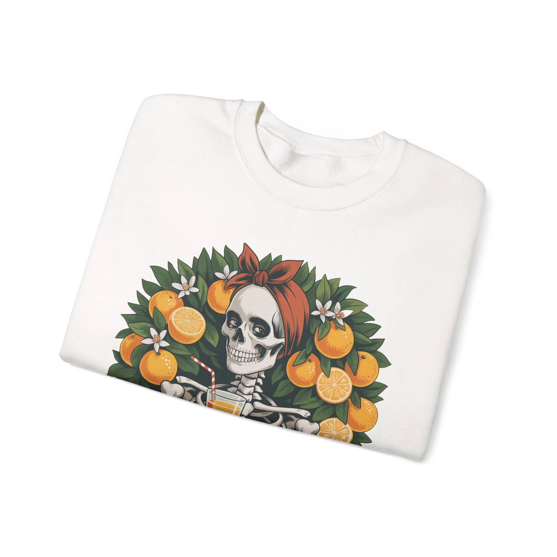 Freshly squeezed, spiritually deceased. This citrus-core skeleton sweatshirt is perfect for spooky girls who serve looks, juice, and zero energy.