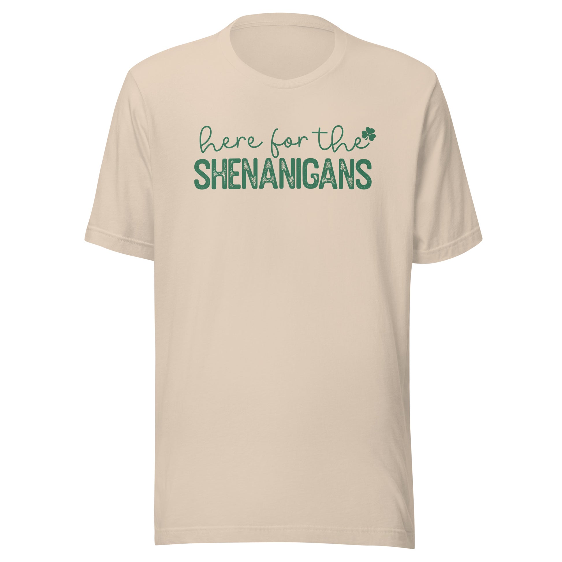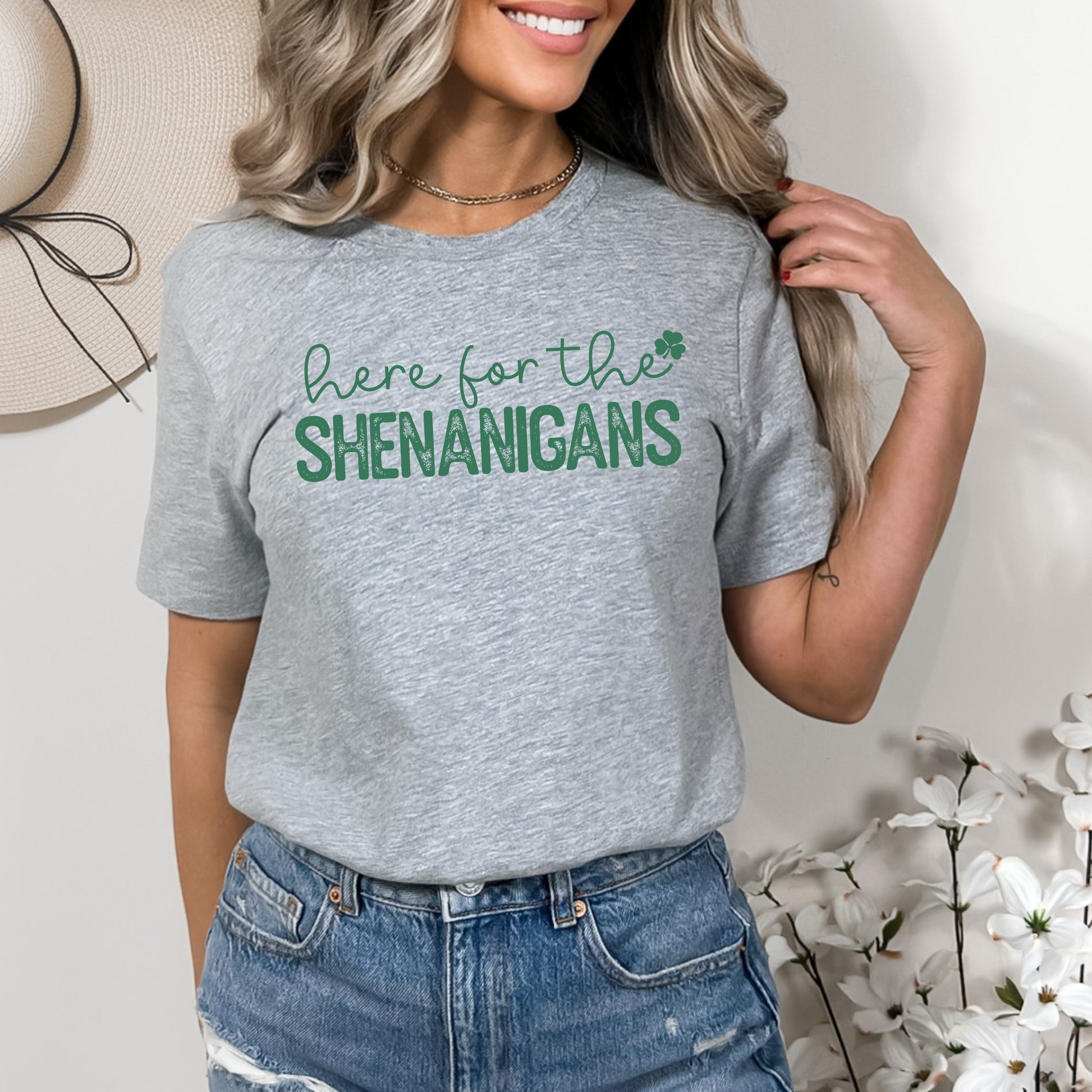 Get ready to stir up some trouble and turn heads this St. Patrick's Day with our "Here for the Shenanigans" t-shirt! Because let's face it, why else would you be here?