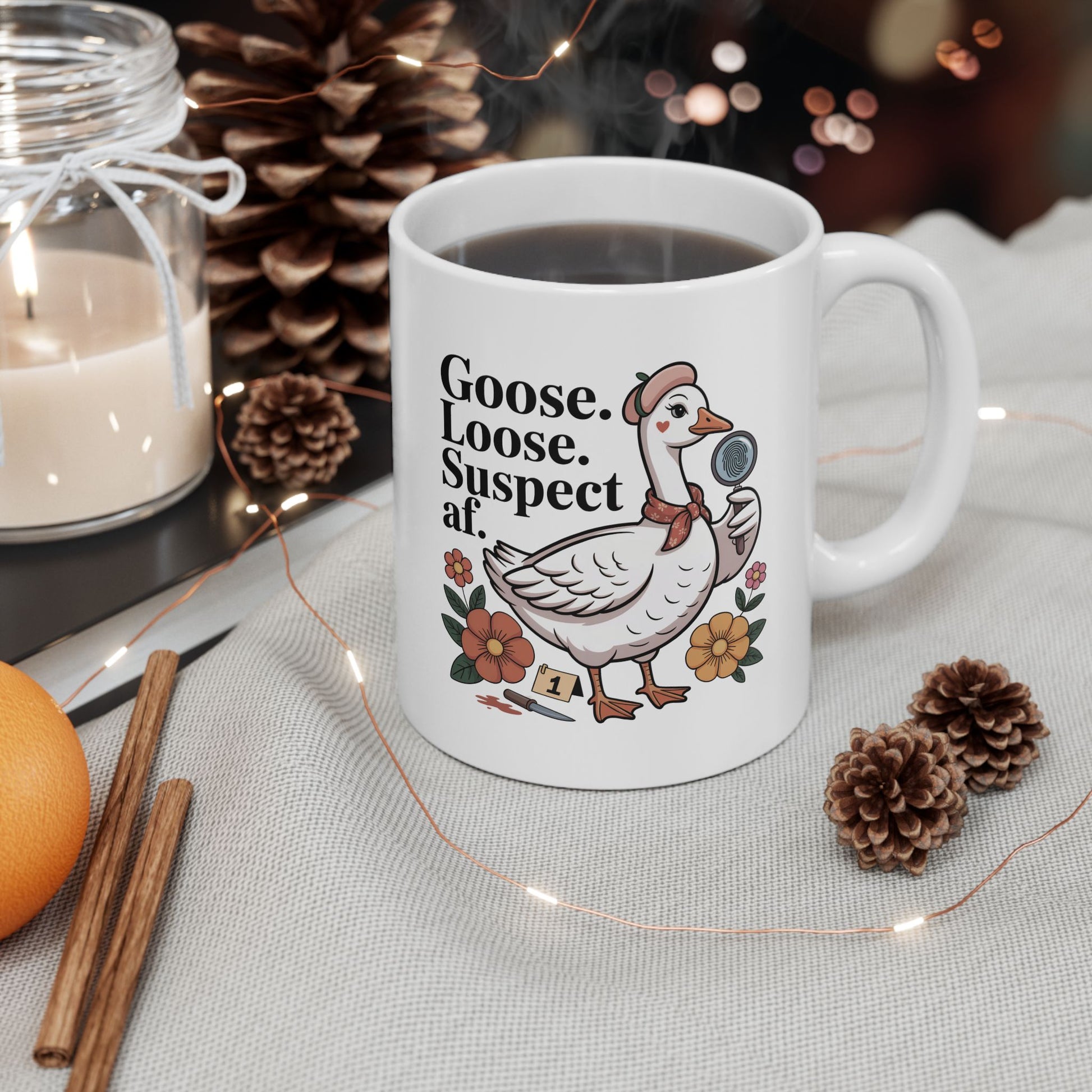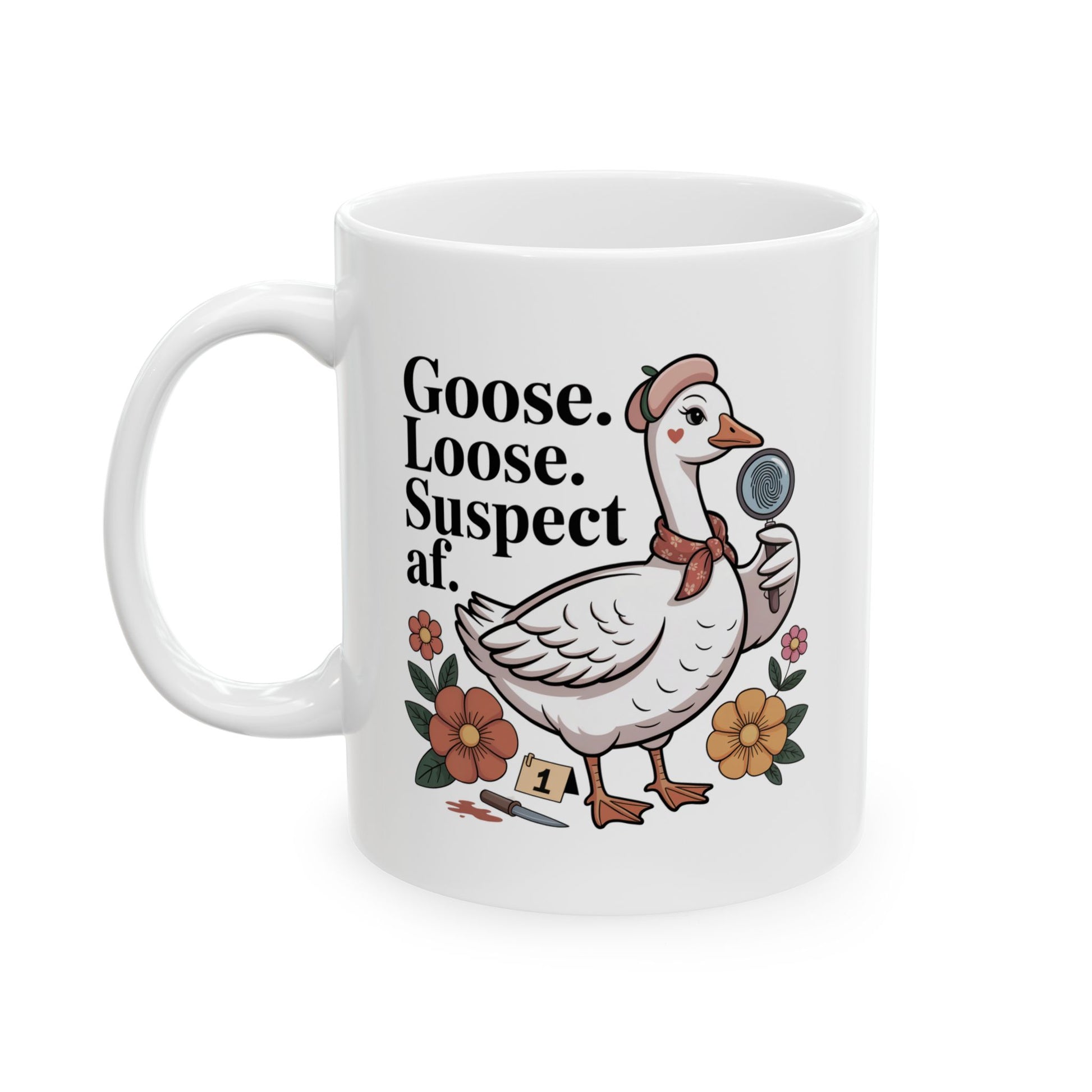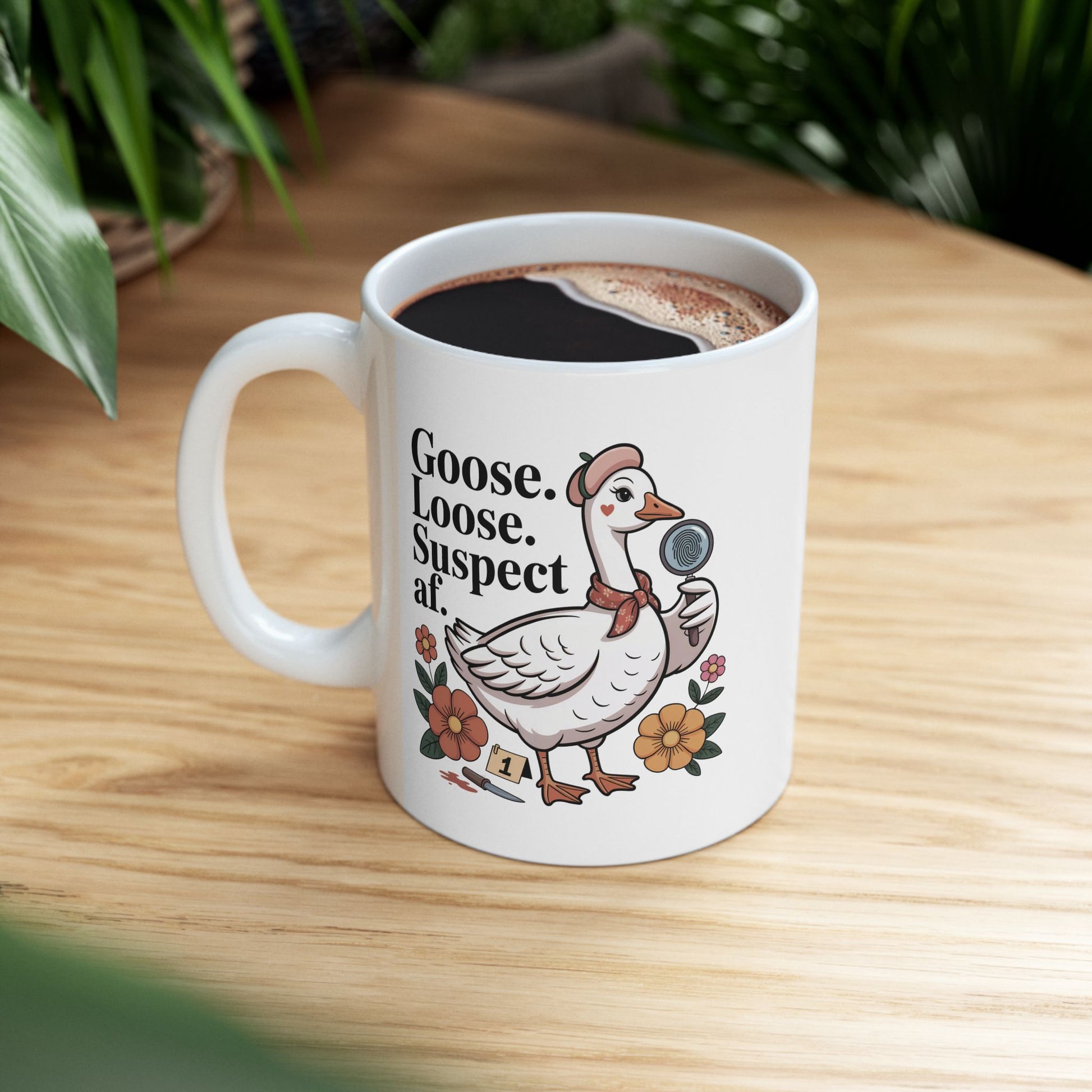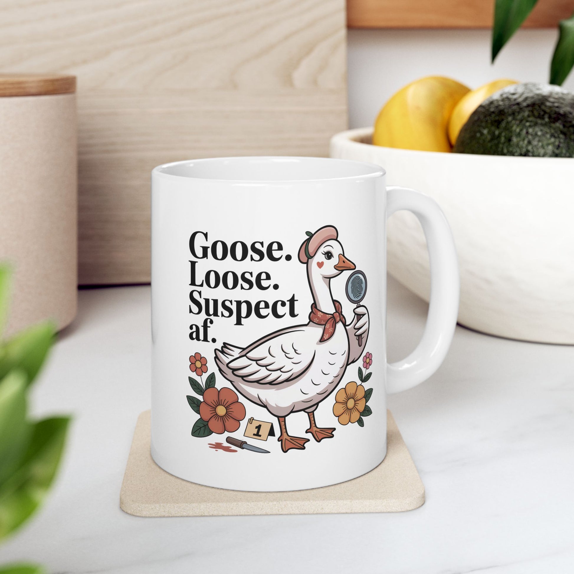 He’s loose. He’s a goose. And frankly, he’s suspect AF. This chaotic crimecore mug is the perfect gift for sarcastic animal lovers, true crime addicts, or anyone who suspects their comfort bird is hiding something.