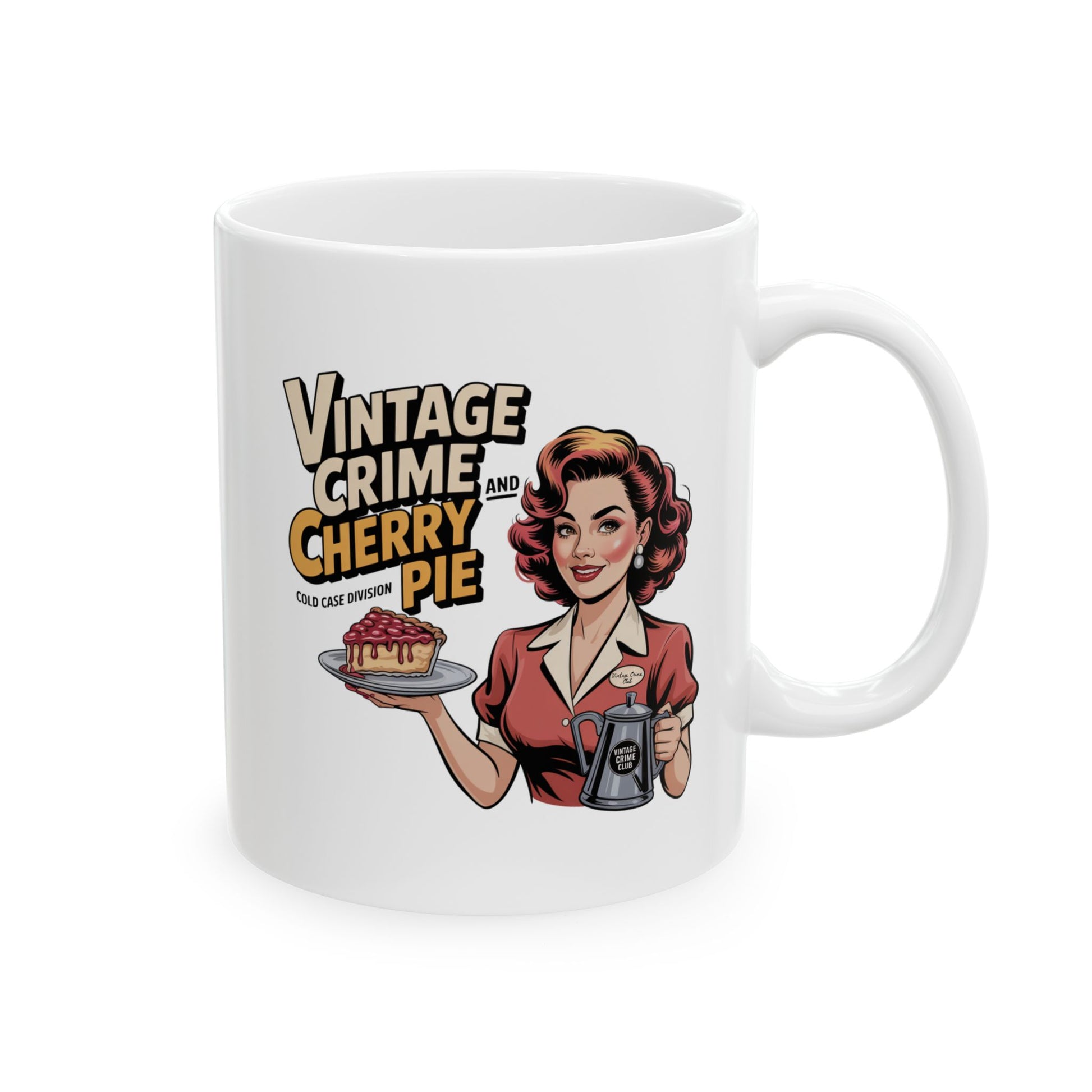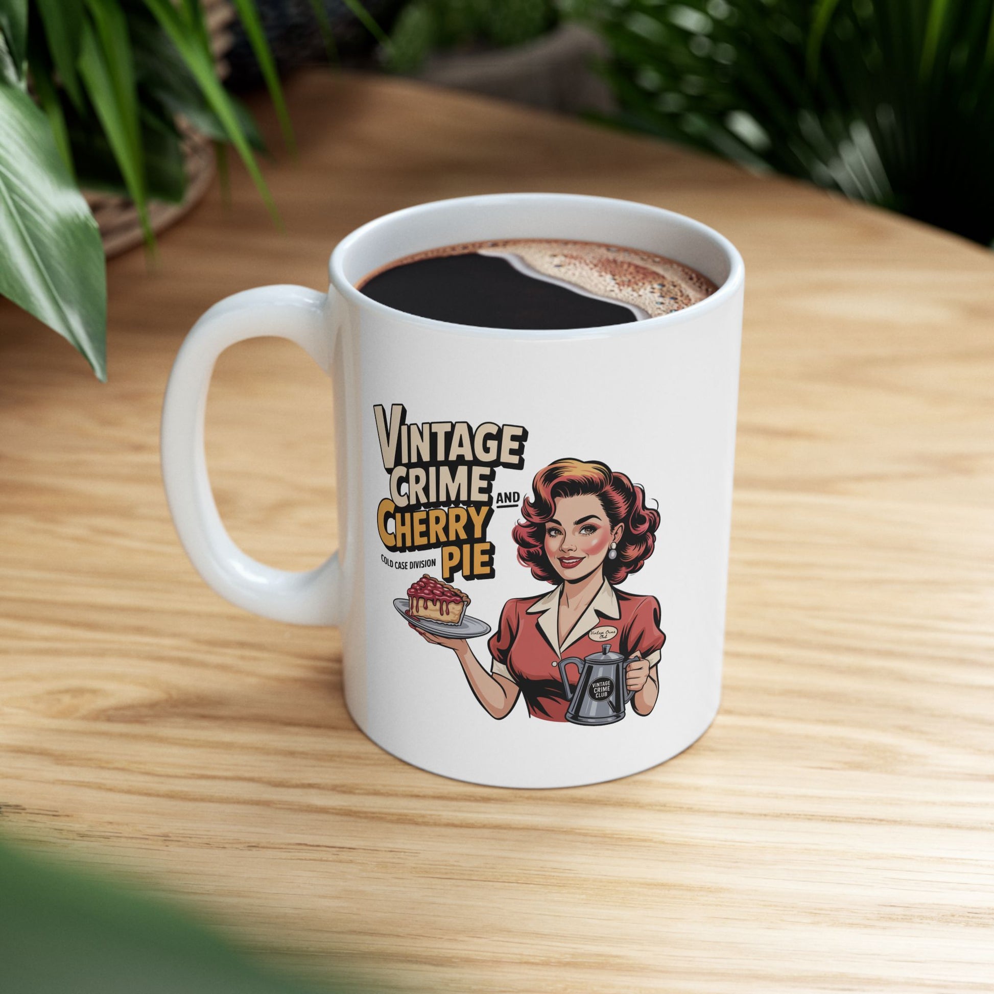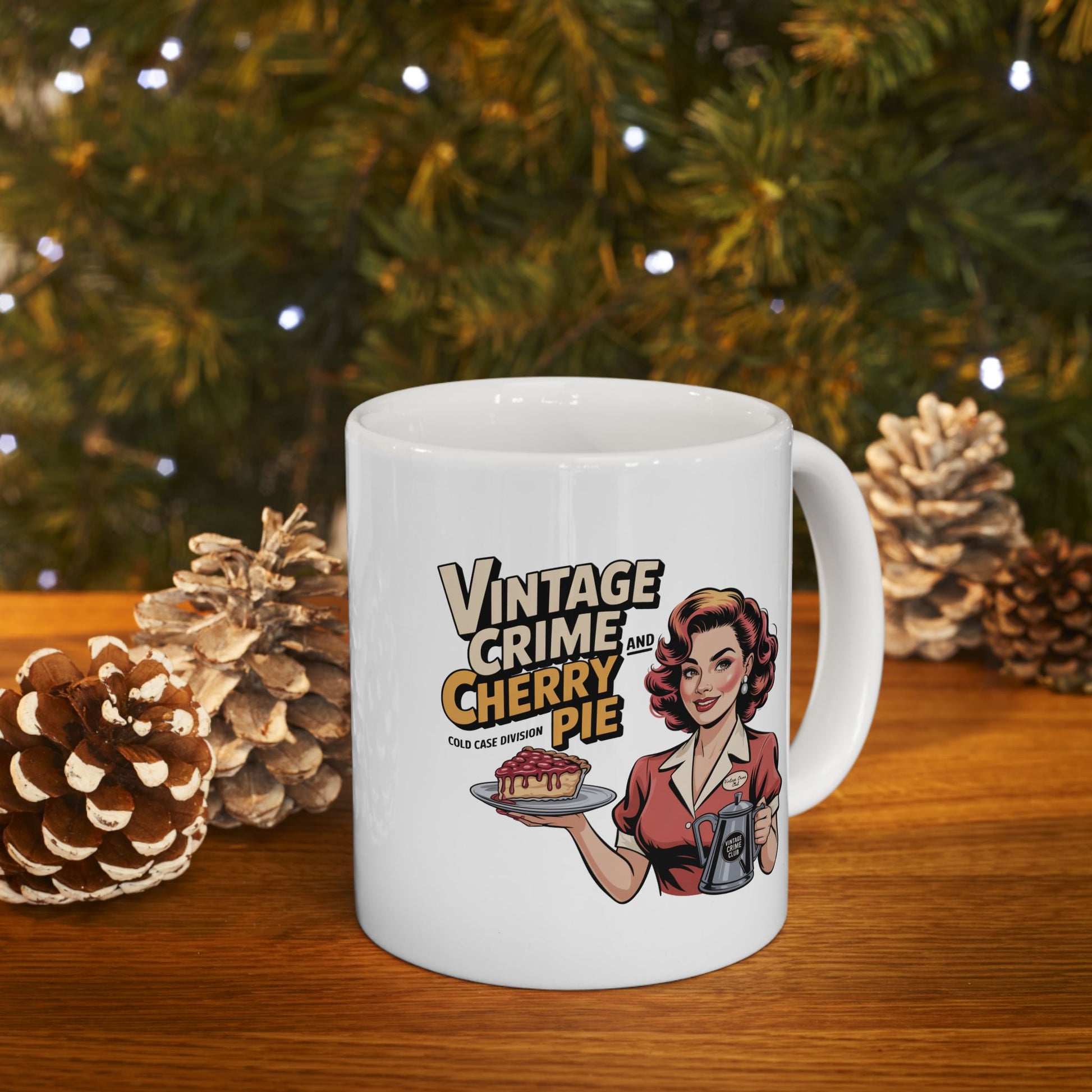 A slice of cherry pie, a pot of coffee... and a cold case to crack. This retro true crime mug is made for cozy sleuths, diner-core darlings, and anyone who likes their murder mysteries served sweet.