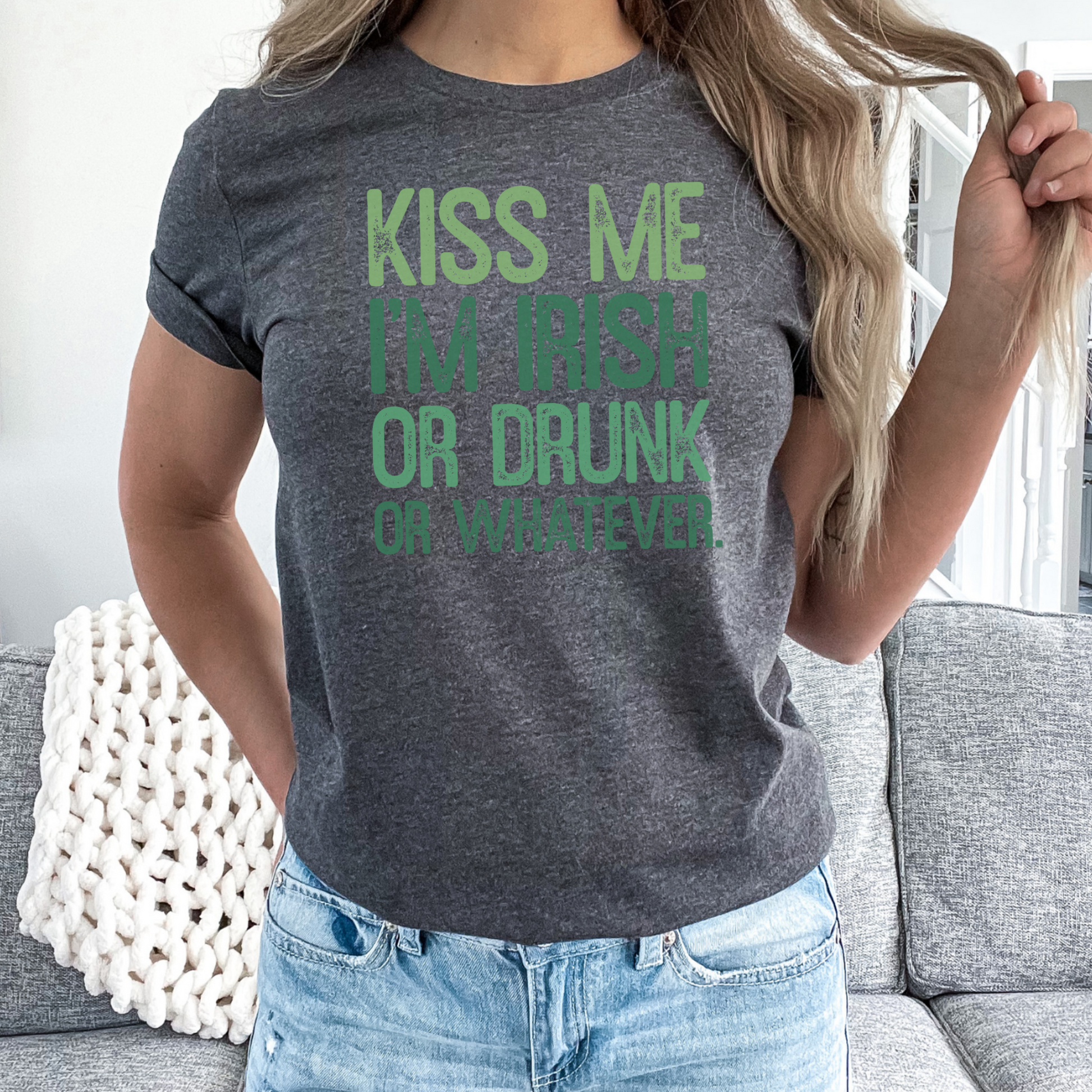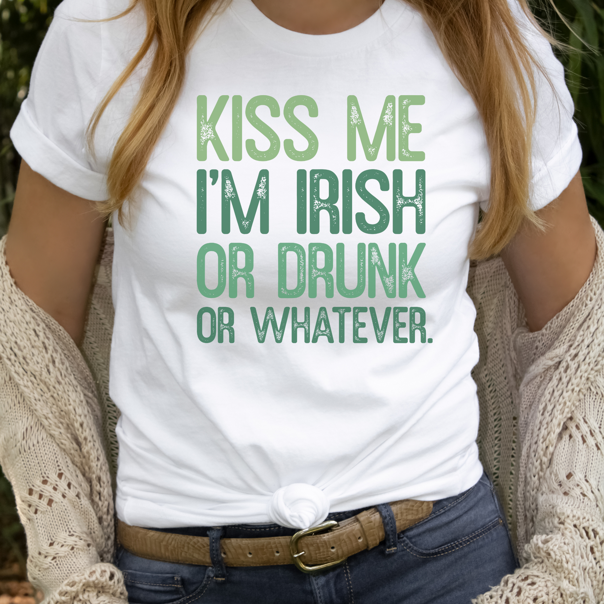 Prepare to make a bold statement this St. Patrick's Day with our "Kiss Me I'm Irish, or Drunk, or Whatever" t-shirt! Because why limit yourself to just one excuse for mischief?