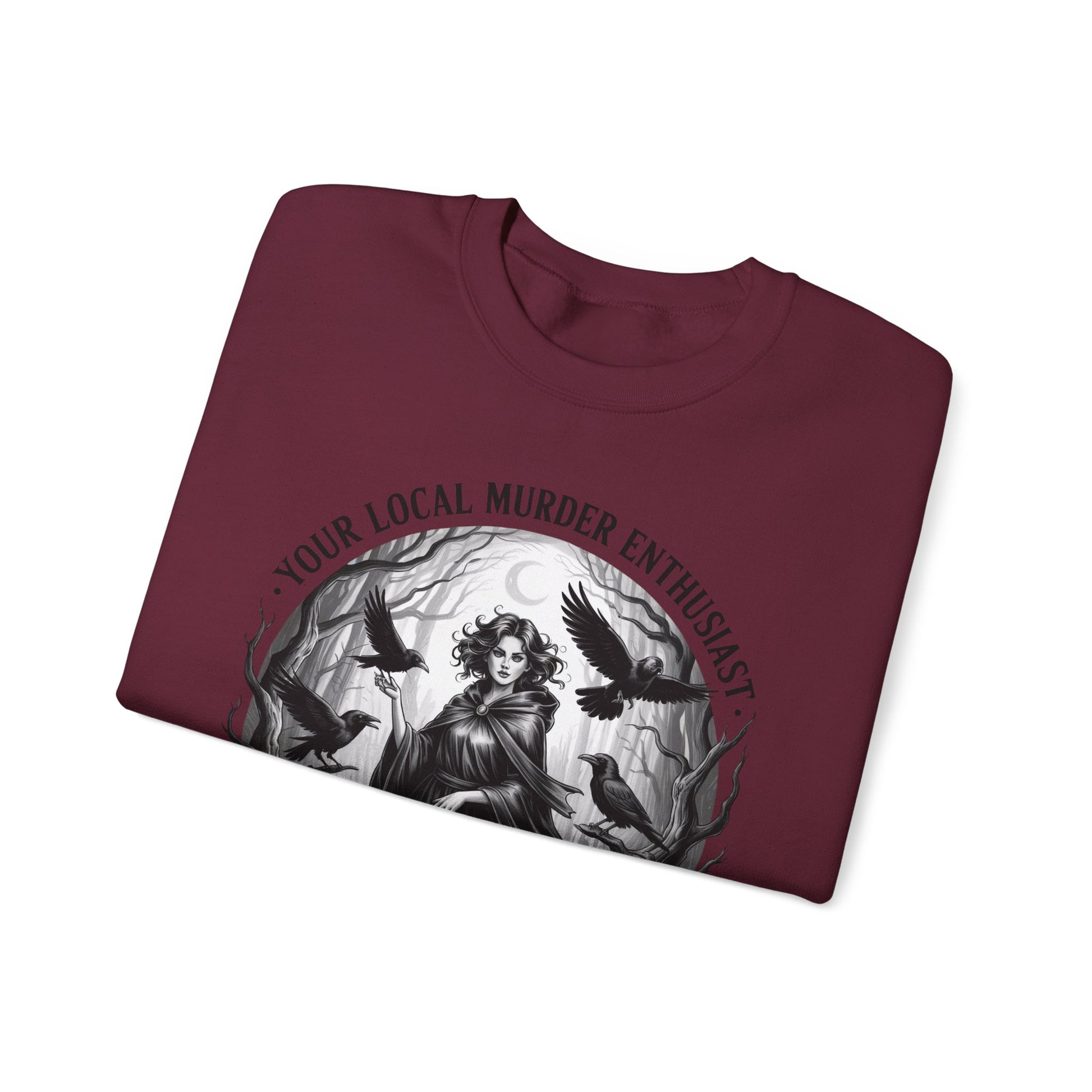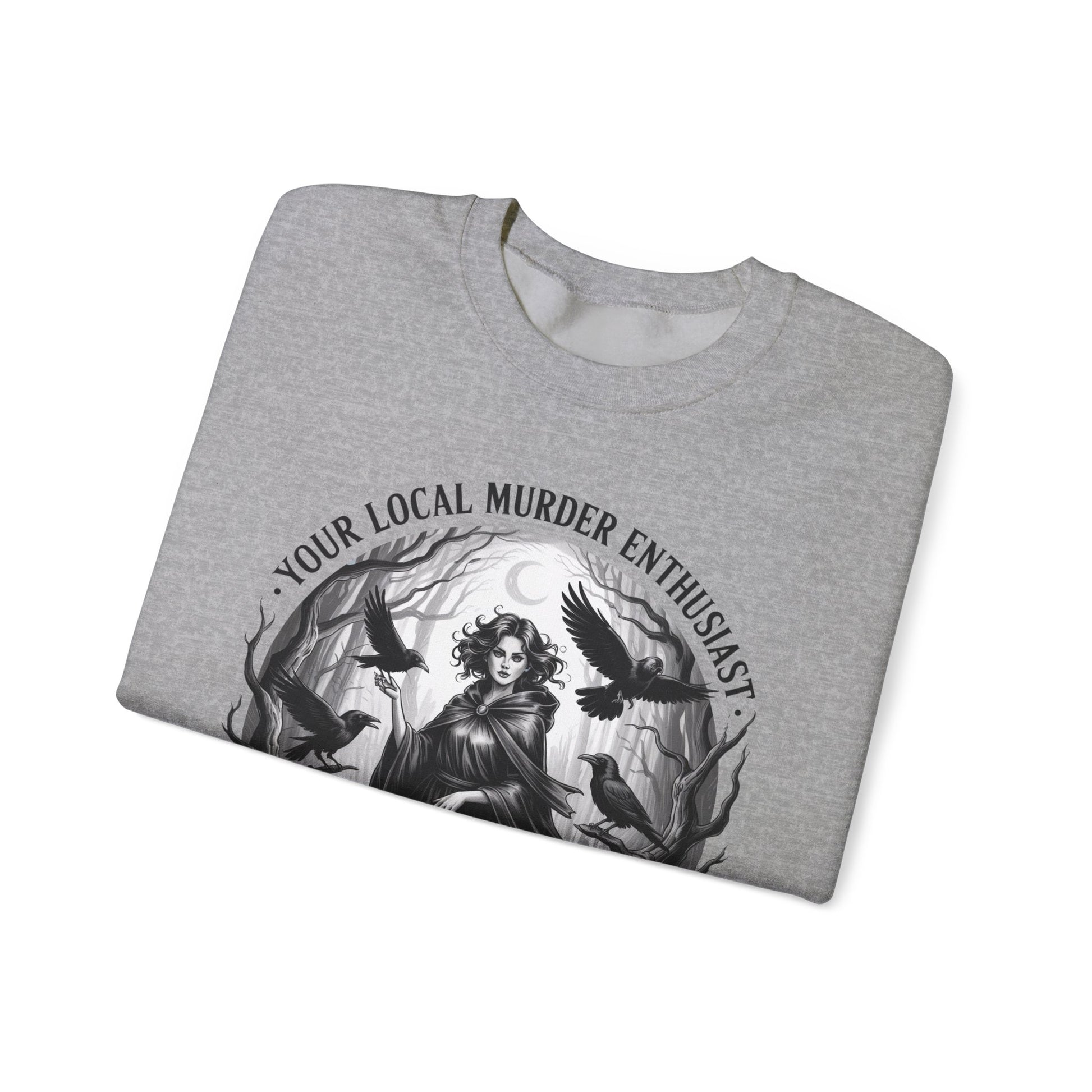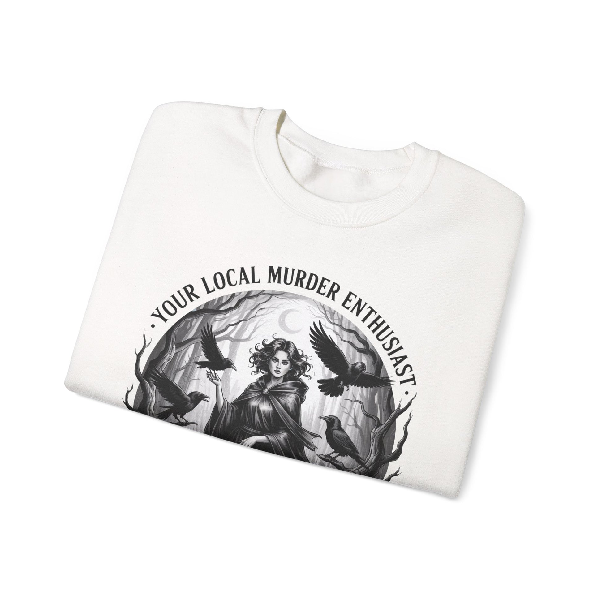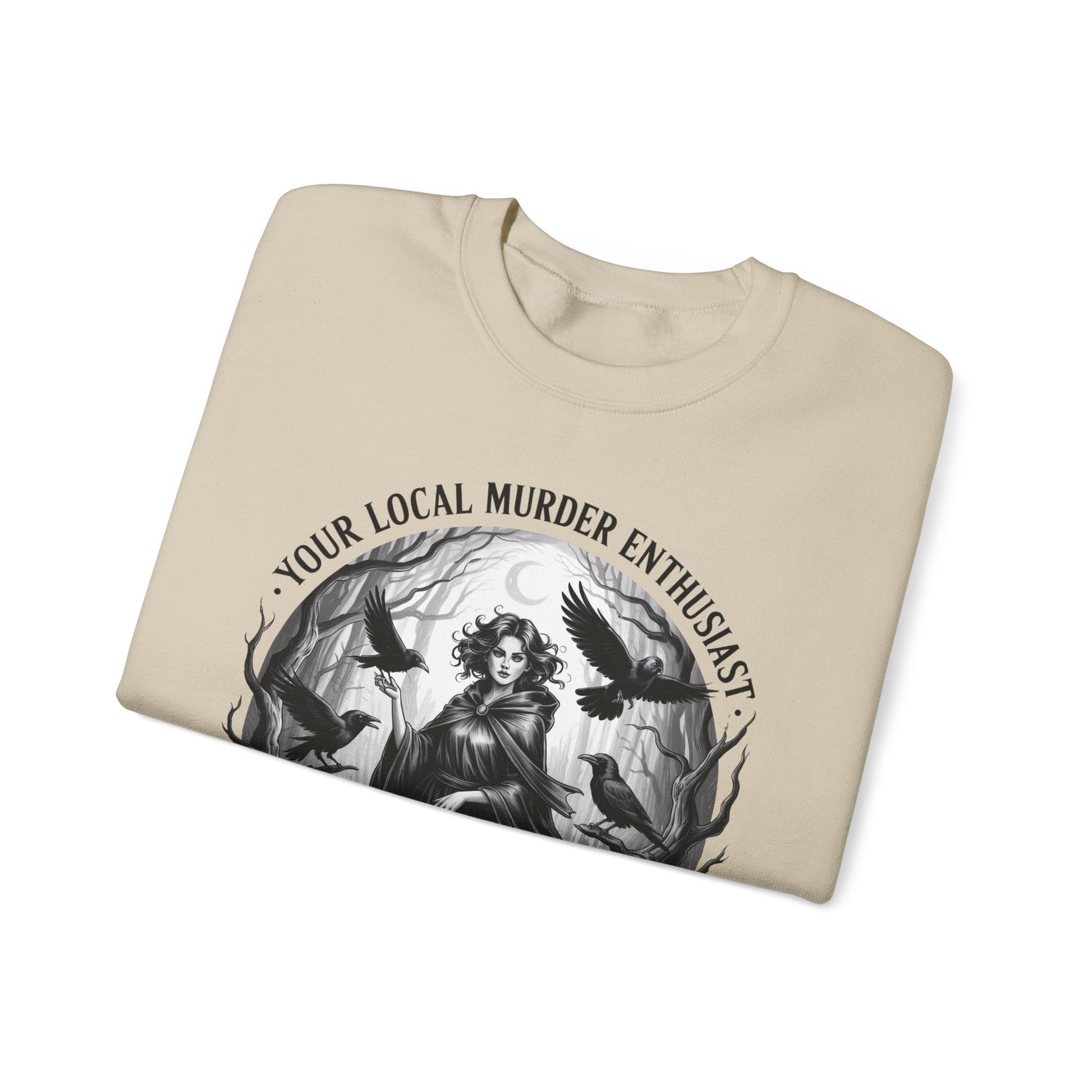 Embrace your dark side—loudly. This Your Local Murder Enthusiast sweatshirt blends witchy vibes, gothic art, and a healthy dose of crow-powered sarcasm. Perfect for spooky season, true crime junkies, or anyone who understands the beauty of a murder (of crows, of course).