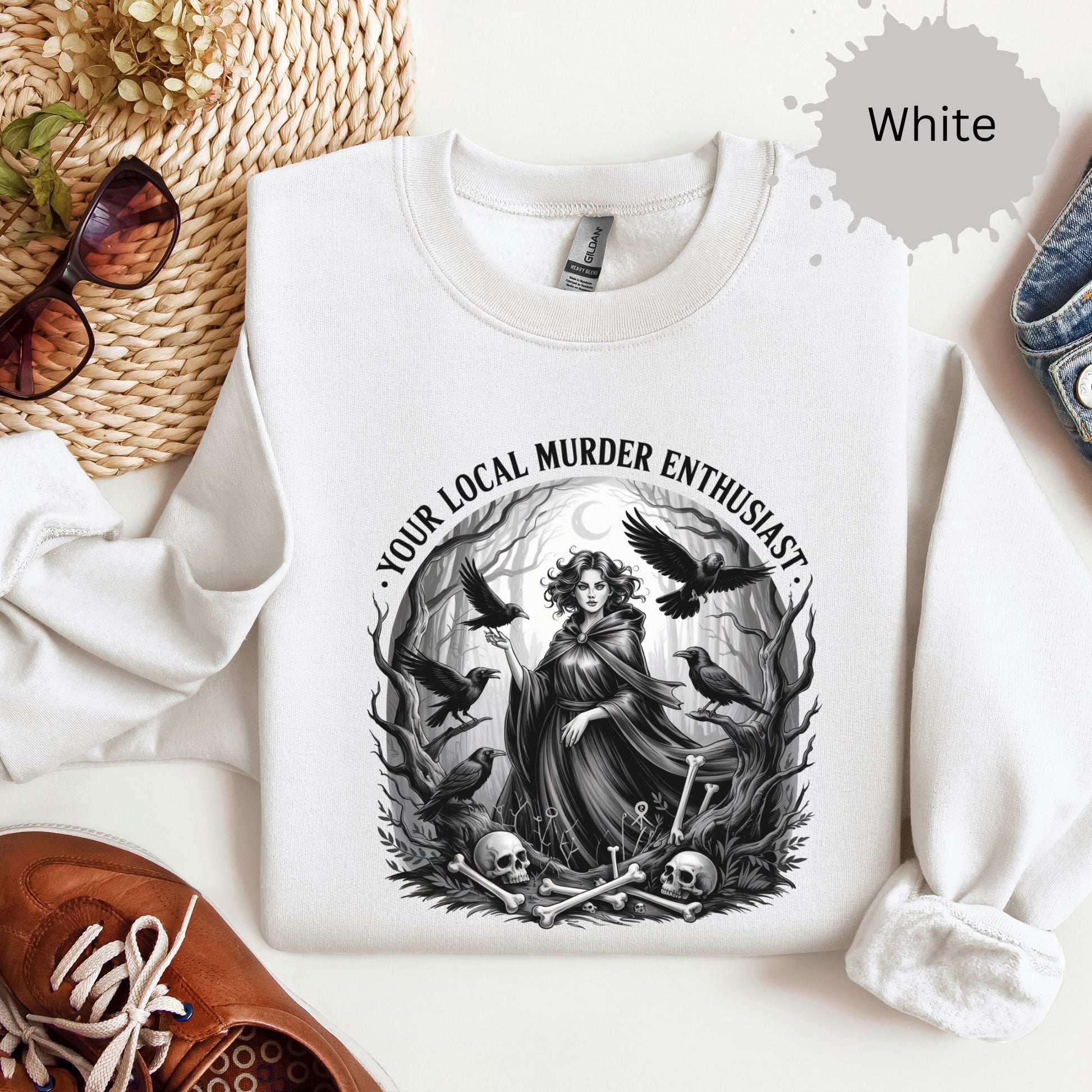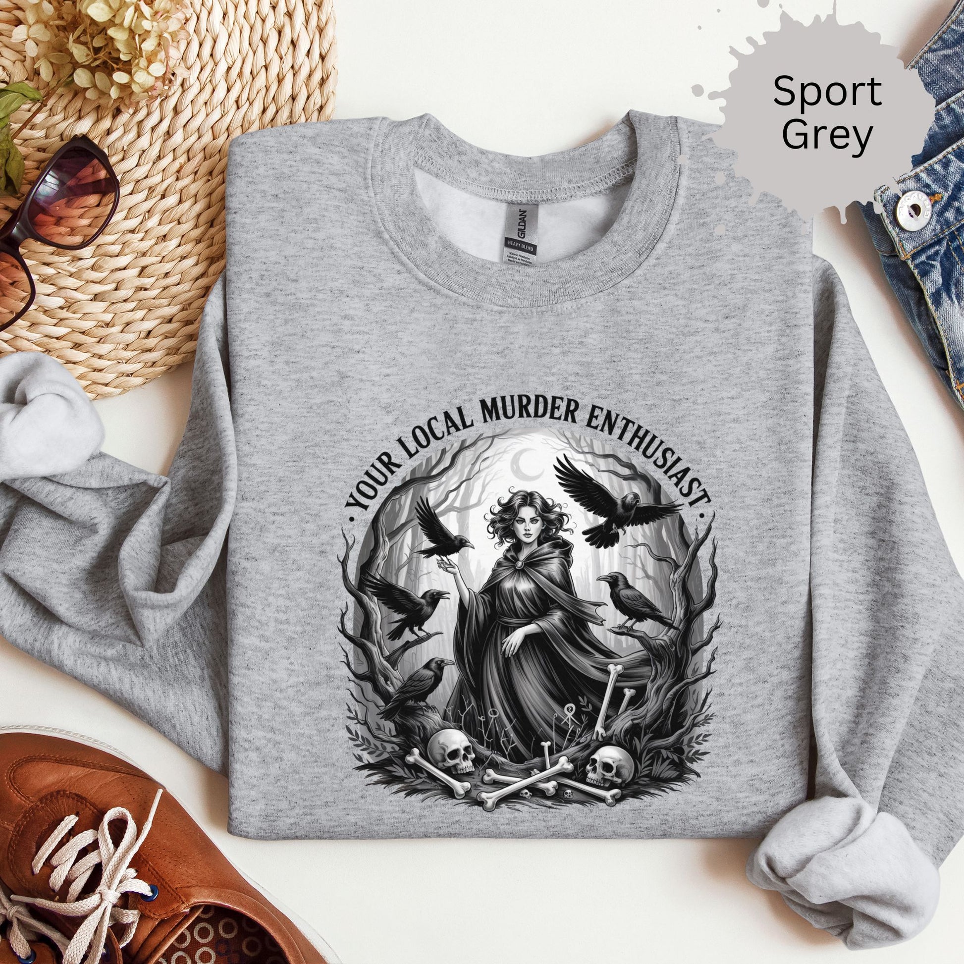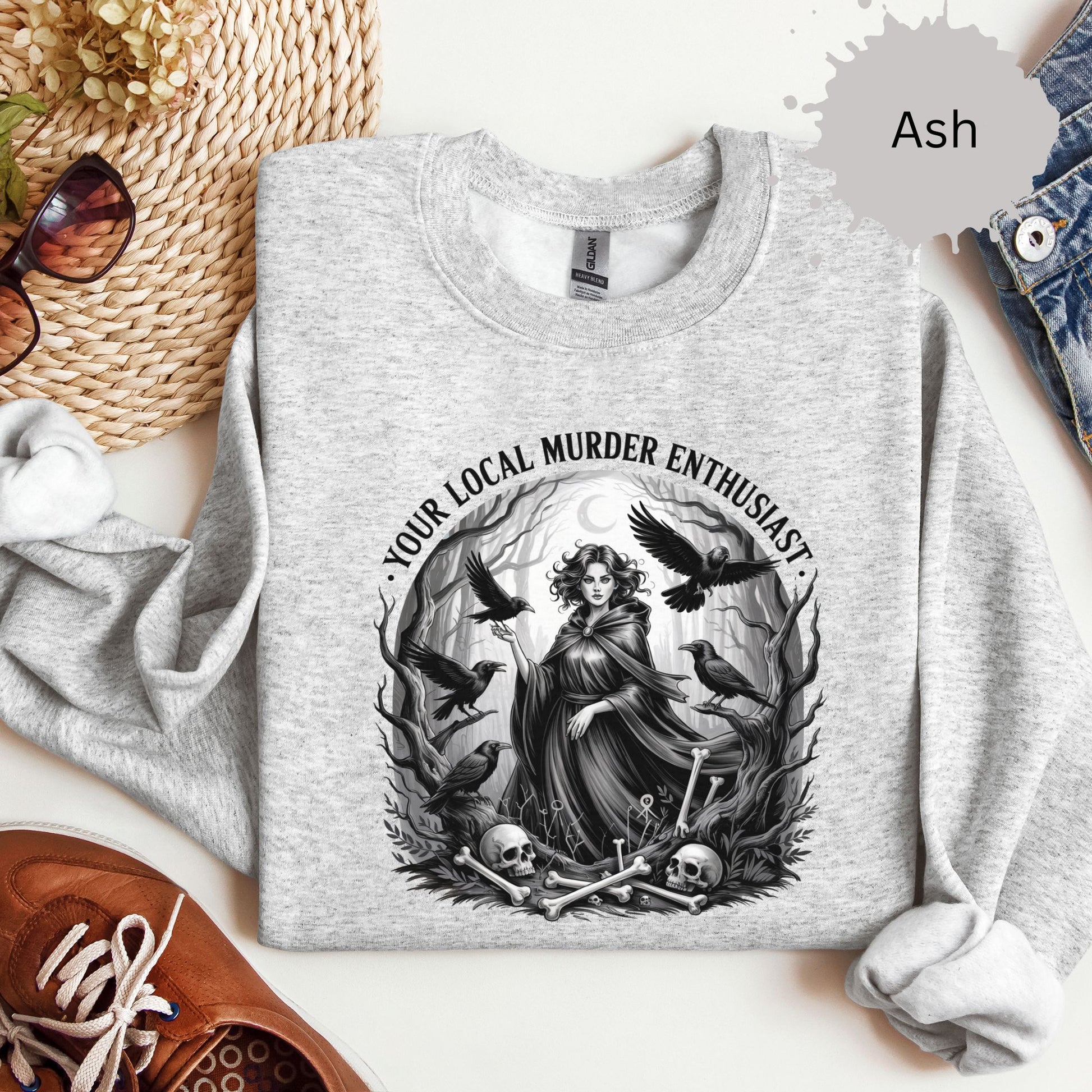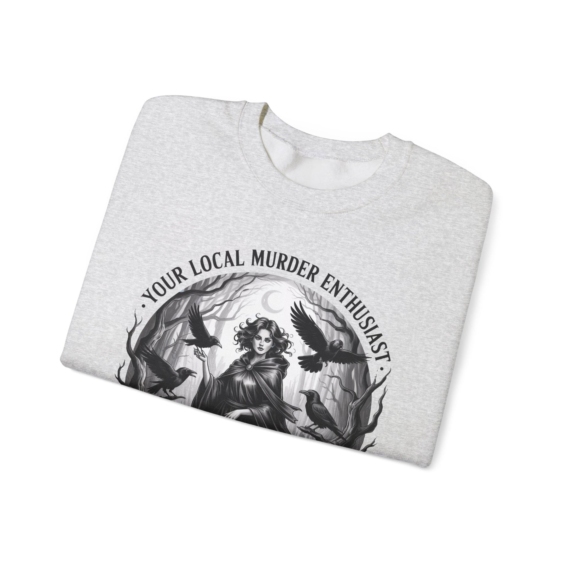 Embrace your dark side—loudly. This Your Local Murder Enthusiast sweatshirt blends witchy vibes, gothic art, and a healthy dose of crow-powered sarcasm. Perfect for spooky season, true crime junkies, or anyone who understands the beauty of a murder (of crows, of course).