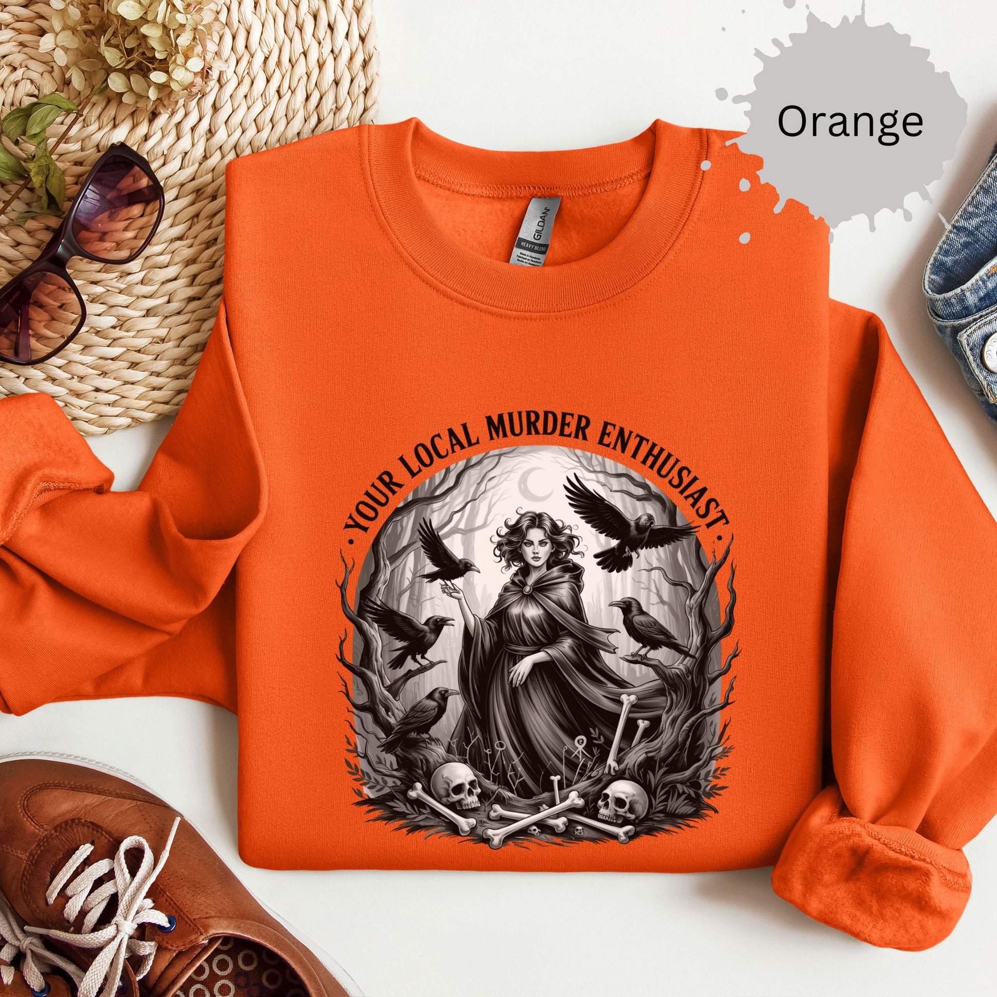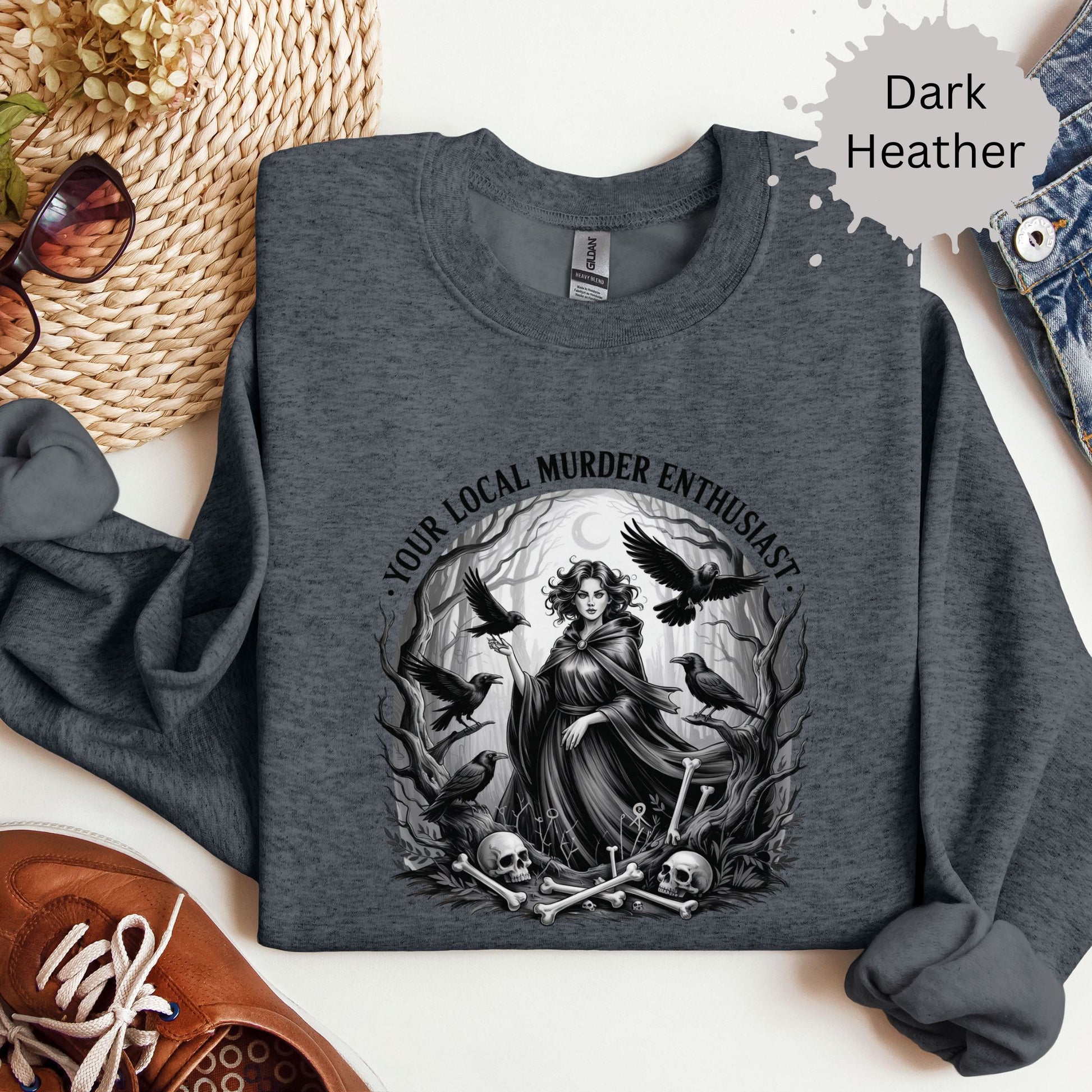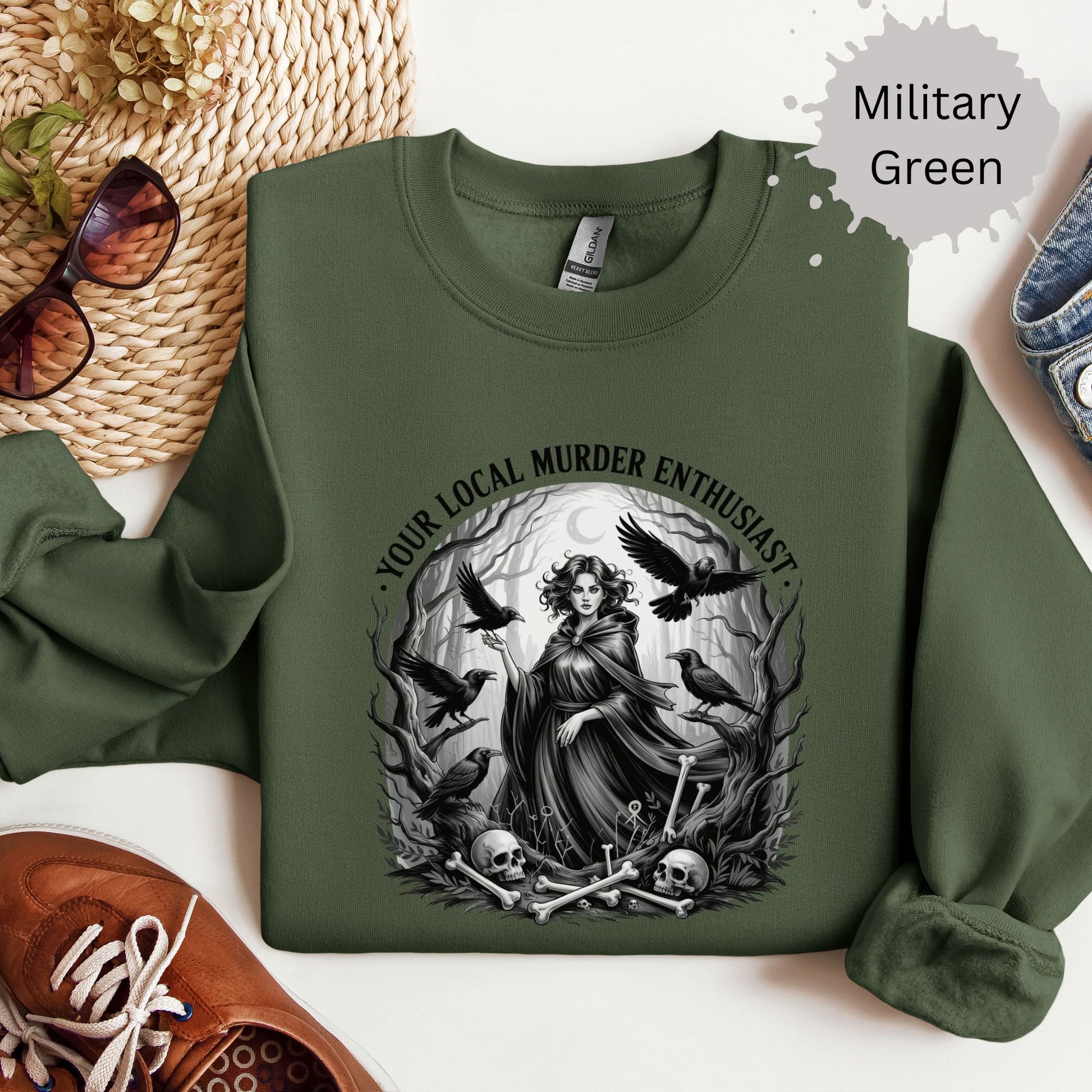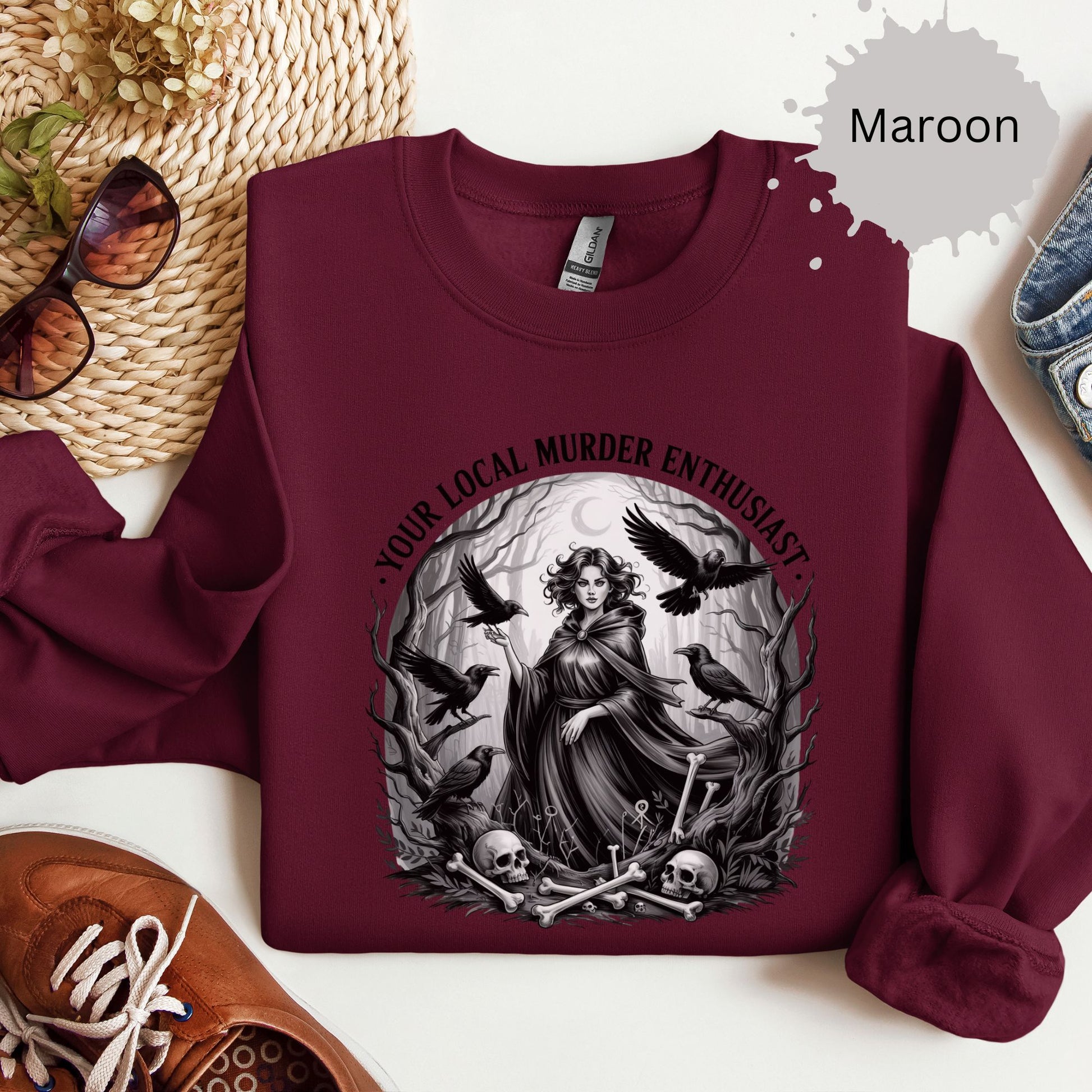 Embrace your dark side—loudly. This Your Local Murder Enthusiast sweatshirt blends witchy vibes, gothic art, and a healthy dose of crow-powered sarcasm. Perfect for spooky season, true crime junkies, or anyone who understands the beauty of a murder (of crows, of course).