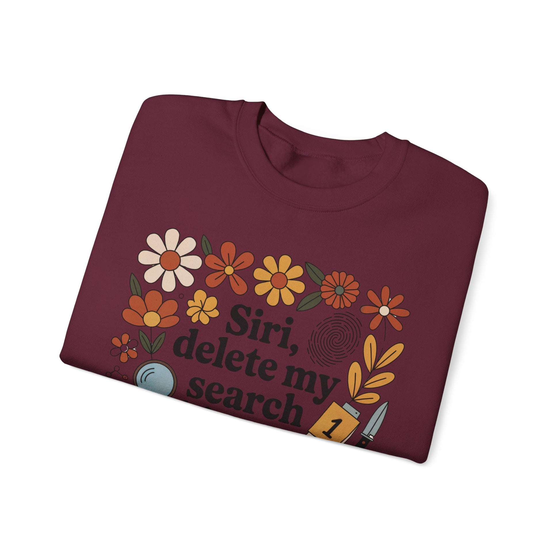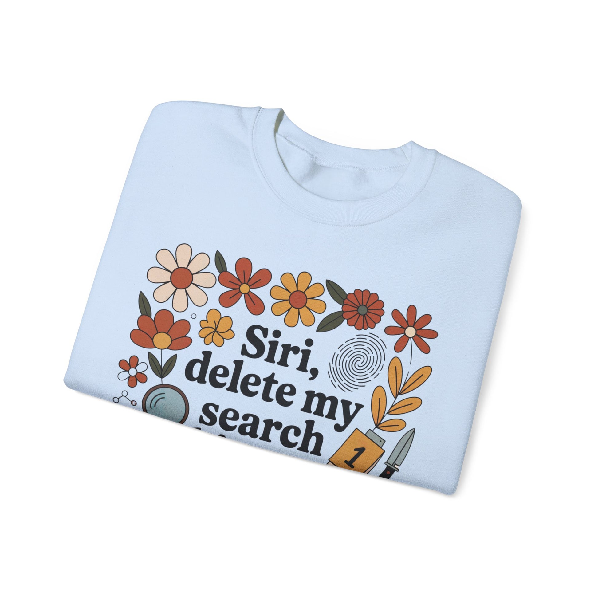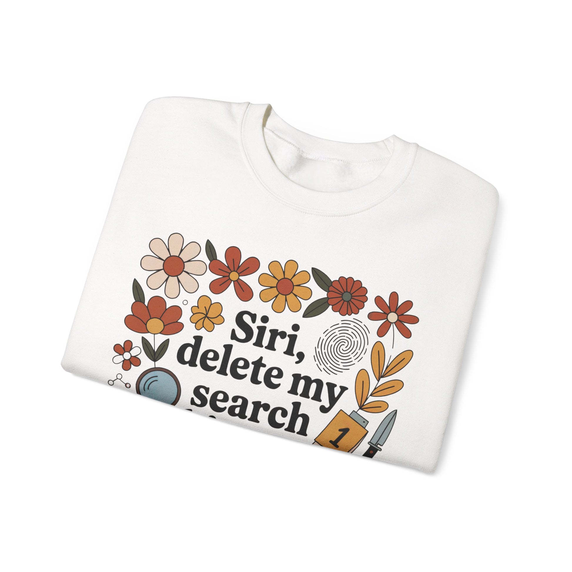 You know it’s bad when even Siri’s concerned. This “Siri, delete my search history” sweatshirt is made for the podcast-obsessed crime sleuth who’s one step away from needing an alibi. Sarcastic, cozy, and questionably legal, it’s the perfect cotton-blend crewneck for fall binging and side-eyes.