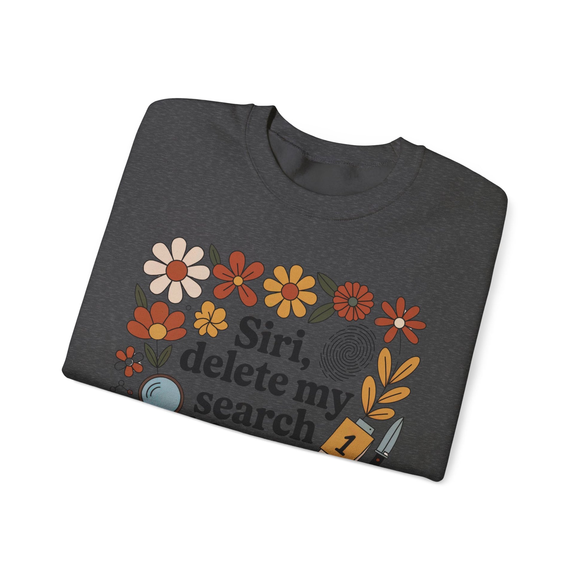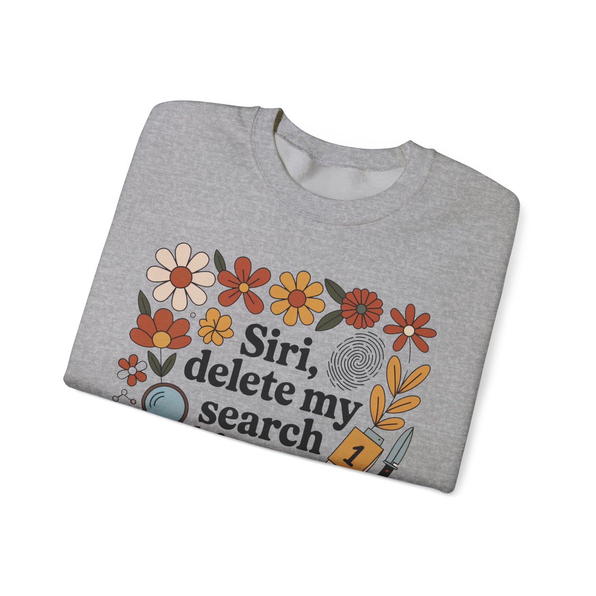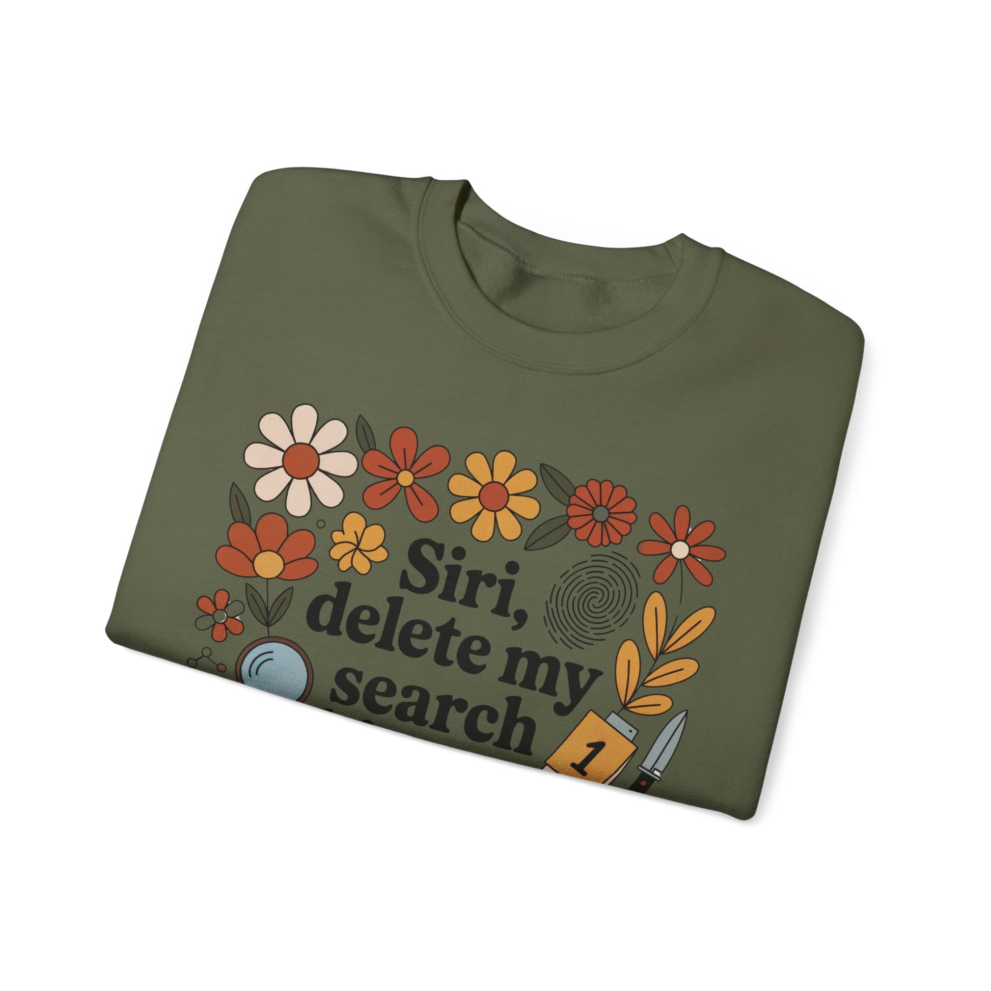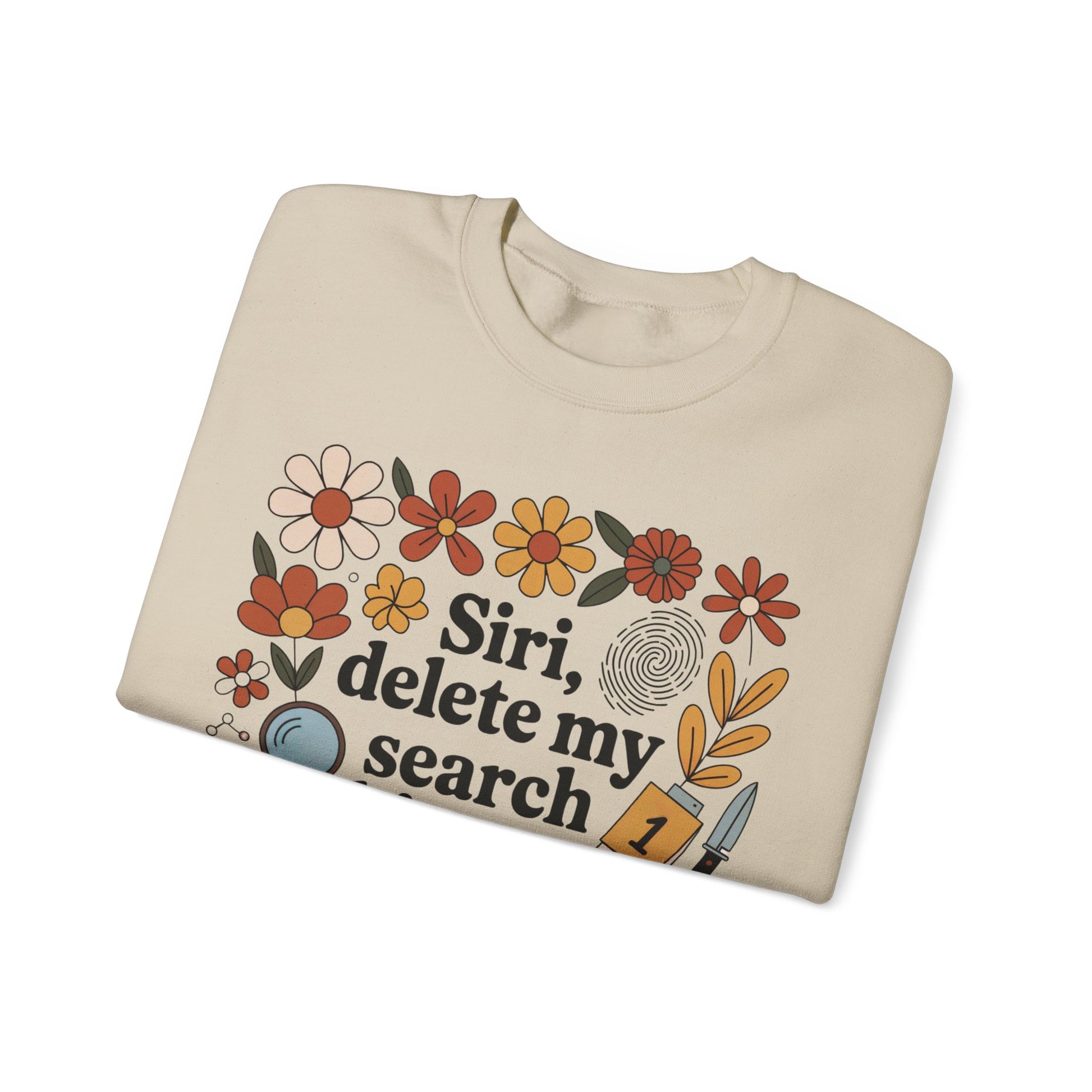 You know it’s bad when even Siri’s concerned. This “Siri, delete my search history” sweatshirt is made for the podcast-obsessed crime sleuth who’s one step away from needing an alibi. Sarcastic, cozy, and questionably legal, it’s the perfect cotton-blend crewneck for fall binging and side-eyes.